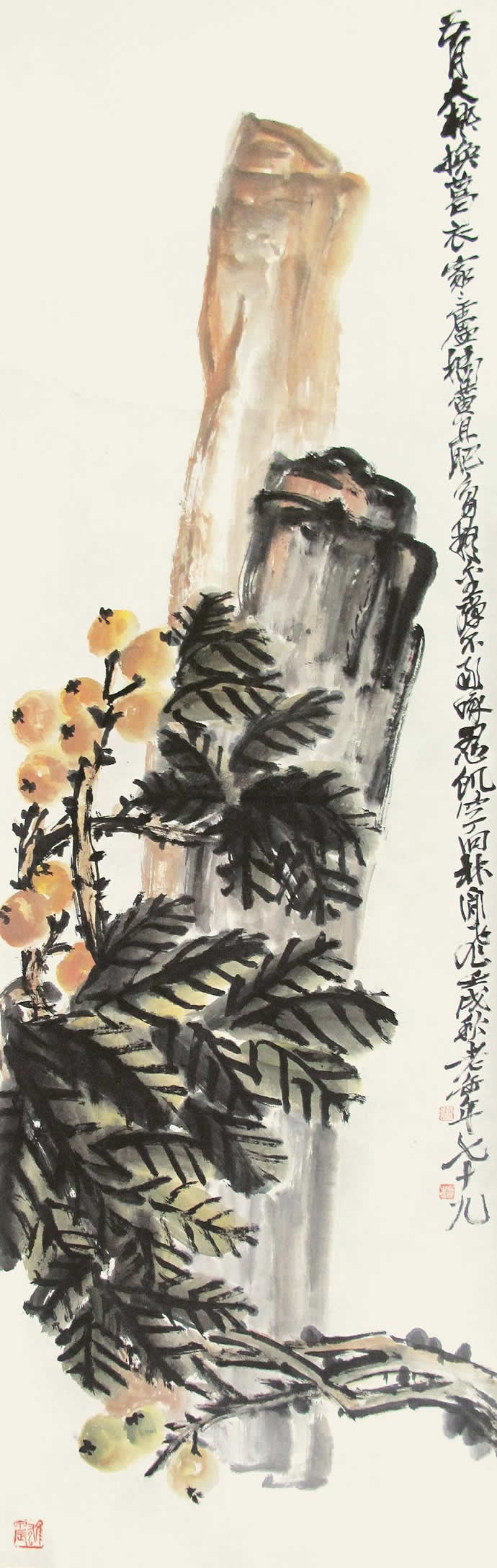 《枇杷湖石图》是吴昌硕作品中极具代表性的画作,据统计,其平生所画不下数十幅。在这一题材的作品中,画中的枇杷果用赭石或深或浅的画出,显得坚实而厚重,且富有生机。在枝叶的处理上则是完全用篆隶的笔法写出,显得质朴而洒脱。吴昌硕画枇杷的时候很少修饰,追求的是一种生命的自然张力。