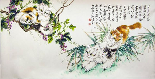 目前,我国以猫为题材进行创作的画家有三个流派:一是曹克家兄弟的工笔画,他们画的猫细腻逼真。二是刘奎龄、刘继卣父子的写意画,他们笔下的猫形象洒脱厚重。三是介于两者之间的孙菊生,有“猫王”之称。他画的猫生动活泼,意趣盎然,给人以呼之欲出之感。
