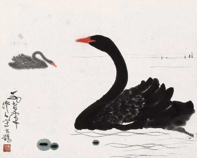 天鹅被视为美丽吉祥和高贵的象征。而原产于澳洲的黑天鹅是天鹅家族中最漂亮的一个品种,观赏价值更高而深受人们的喜爱。黑天鹅形体优美,雍容华贵,性格斯文,与人亲善,文静端庄。吴作人笔下的黑天鹅,别创一格,富有情趣,神态逼真,惹人喜爱。吴氏黑天鹅「潇洒蕴藉而气度高华,悠游而风神超脱」,恰如其分。