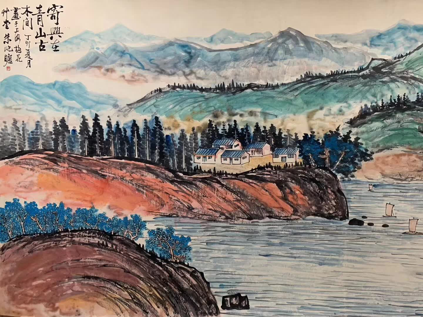 不断的“探索”、“求索”是朱屺瞻画艺取得成功的重要秘诀。先生把画的一切与生活的一切连到一起,特别是把画的感觉和画的技法同人生、道德连起来看。他说“我作画喜‘厚’字,觉得厚近仁,仁近生”。画如其人,为人仁厚,画面厚实。整幅画气势恢宏,画面厚重,黑白对比、色彩对比均极强烈,浓淡变化也非常丰富,三组建筑点缀青山白云之间,山色间近景以赭石为主、中景以石绿为主、远景以石青为主,构图饱满,酣畅淋漓。江面上帆船点点,一幅可游可居的人间仙境呈献在我们面前,无论笔墨还是意境都堪称传神之作!