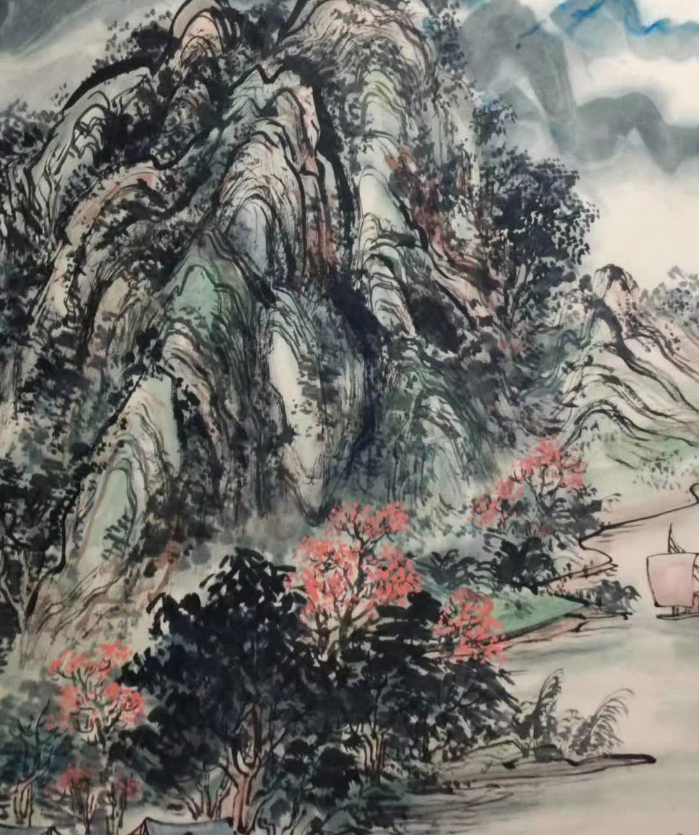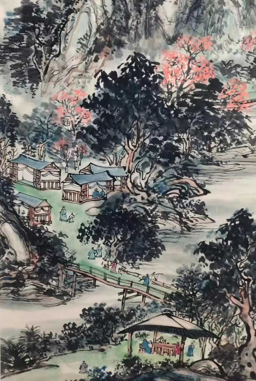 该作品以青绿法挥就,画面清新雅丽,色不碍墨、墨不碍色,水墨与青绿交相辉映、自然天成,可谓是黄宾虹青绿山水的代表之作。画面阴阳幻化、黑白对比、虚实互衬,色墨相彰,无处不显示出画家的高深修养和控制画面的高超能力。近景一桥连通两岸 ,朱栏阁屋茅舍数间安置于翠峦松冈中,人物众多,写出一派世外桃源之境和画家心中的美好家园。