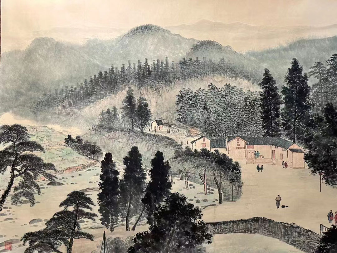 此画为傅抱石以中国共产党和新中国的缔造者毛泽东主席家乡韶山为对象而绘制的写生纪游之作,寄托出画家对毛主席的崇敬热爱之情。全幅以丈二形式呈现,将毛主席故居和蓊郁的丛林、竹丛以及明澈的水塘、宽阔的道路、高挺的韶山峰峦、起伏的山川在笔下绘写出来。画家将水墨、浅绛和小青绿山水相融汇,又将西方的色彩观念和素描造型手法加以融会贯通,营造出韶山地区特有的山水景物,呈现出青碧蓊郁、秀美幽邃、迷离苍茫的审美意象。全幅气势恢弘雄伟,格调清新自然,为傅抱石革命纪念地题材的经典巨作。