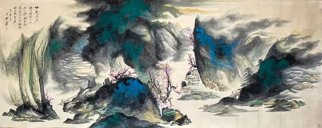 展读大千先生此幅《登山临水》之巨制,气韵生动苍茫,用笔雄健奔放。整幅画变化奇诡,显现出幽幽山谷的深不可测,使人感觉到一股清冽之气直透心脾。全画以青绿墨色泼洒及传统笔墨皴擦并重,融古出新,共冶一炉。泼彩的抽象与传统勾皴的具象实现有机结合,气象万千。在传统与现代、抽象与具象的融合中,构建出一个缤纷灿烂,仿若梦境般奇幻的美景。张大千数十年间壮游万里,过海飞天,登山临水,胸怀非斤斤笔墨者所能梦见。