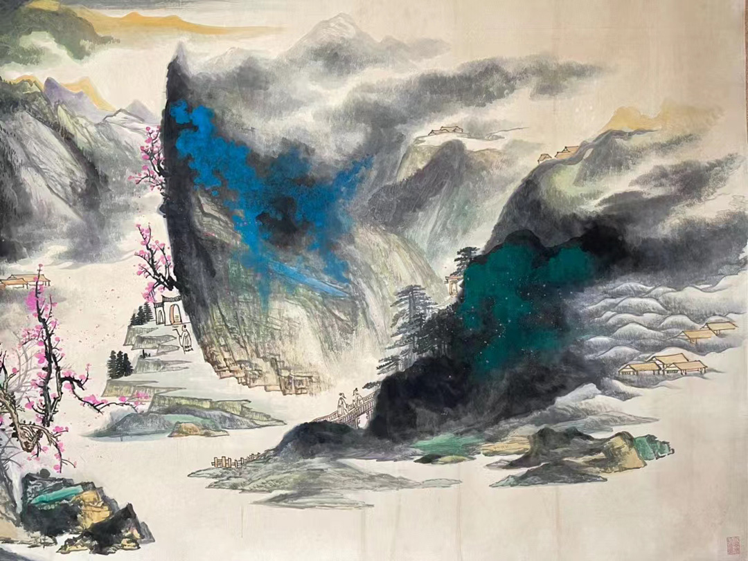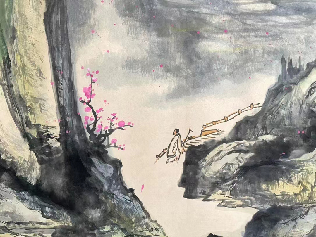 整幅作品点景人物众多,这在其泼彩画作中极为罕见。画面左下角及中部各有一高士著白色长袍,手持杖行走于山间小路中,似往山中寻幽访胜,画面右侧两个高士在小桥之上交谈。山间数处嫣红粉嫩,烂漫怒放的桃花为此作又一亮点,与2016年以2 .7亿港币成交的张大千之《桃源图》有异曲同工之妙。
