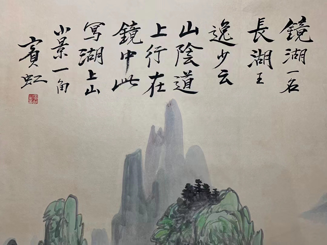 此《镜湖山景图》宾翁曾作过小幅,此幅乃丈二巨制,实难得。本幅是黄宾虹先生对自己传统山水画研究和创作的一次理论性总结。既可从中一窥黄宾虹的艺术面貌,也可以看出黄宾虹对于墨法的运用已经进入化境,墨法更加丰富多变,画面反而呈现出清淡之意,这是黄宾虹晚年佳作的一个重要特征。此作所绘为记游山水题材,表现的即是高人逸士寄情绘事之文化积淀深厚的浙江绍兴镜湖会稽山一带景色。镜湖即鉴湖,在浙江省绍兴城西南,古人有「鉴湖八百里」之誉,可想见鉴湖当年之广阔。书圣王羲之曾发出「山阴道上行,如在镜中游」的感慨, 可见湖水清澈,水质极佳。画中景色瑰丽奇异,亦正如王献之所云:从山阴道上行,山川自相映发,使人应接不暇。