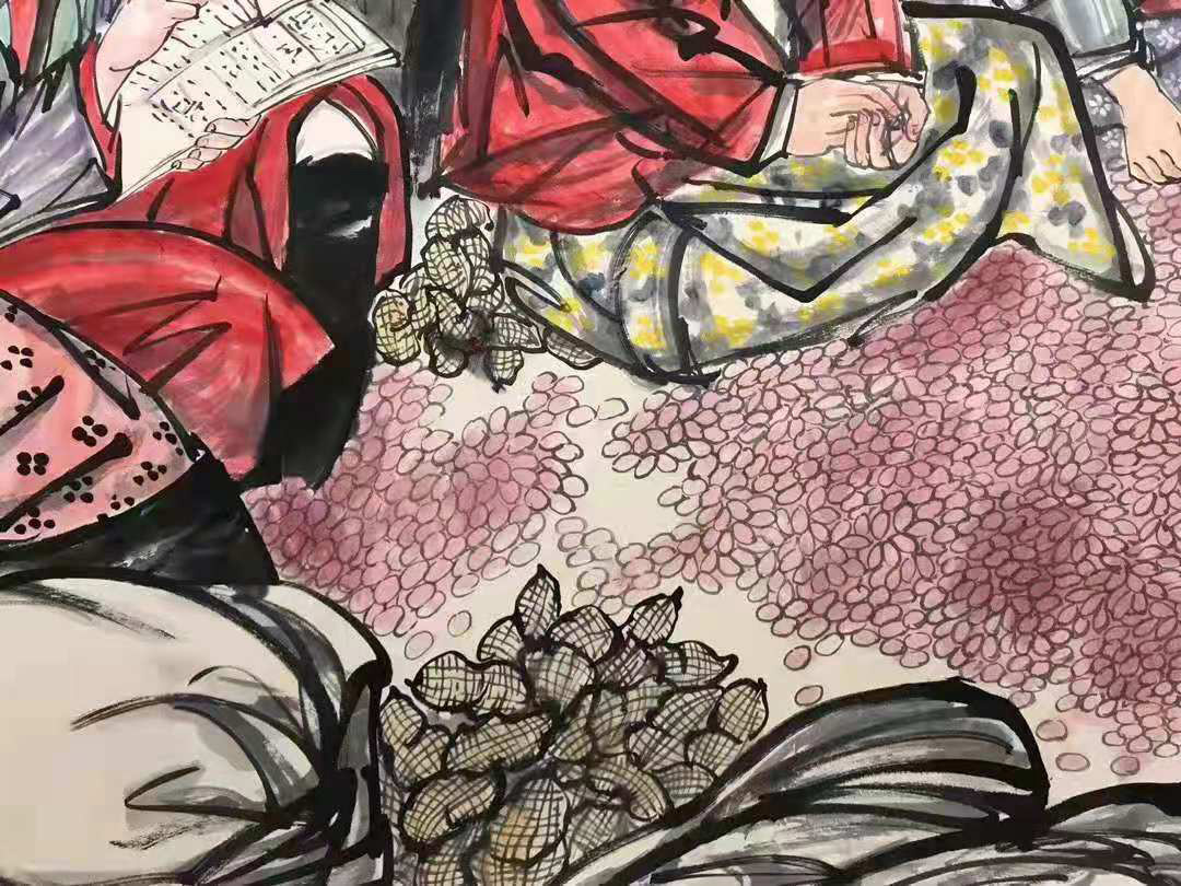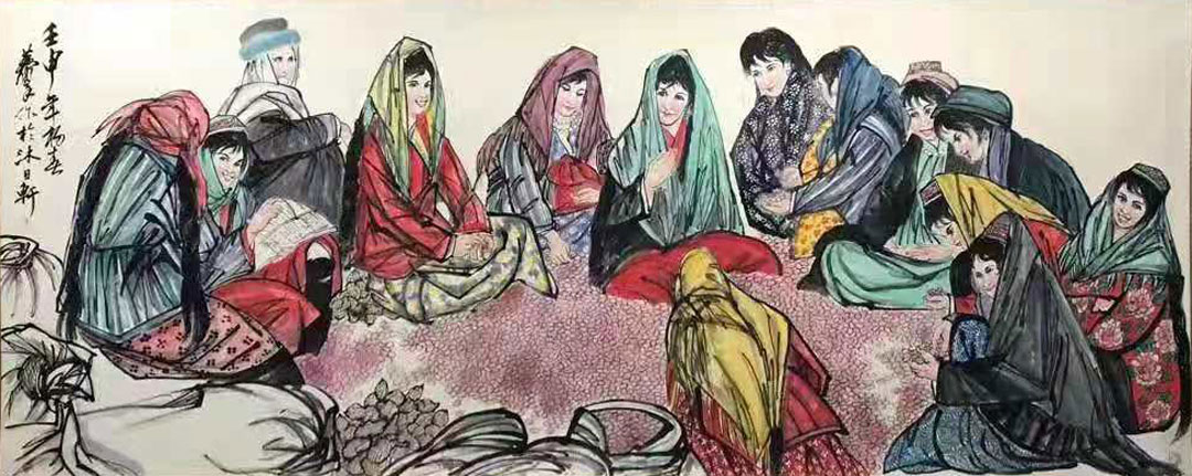 在20世纪50年代至60年代,黄胄长期深入新疆、青海、西藏等少数民族地区,他通过边疆采风的方式积累了大量的生活速写,并以此为基础针对边疆题材创作了不少佳作。《选良种》是黄胄早期的代表作之一,此题材黄胄始创于上世纪60年代。堪称黄胄多人物、大场面的典范巨制,是新中国劳动妇女精神风貌的时代写照。画面取材于那个特定年代新疆的一个劳动场景,截取了维族妇女围坐一团,边听读报,边选良种的热闹场面,体现出画家对人物情态精准的把握和拿捏。