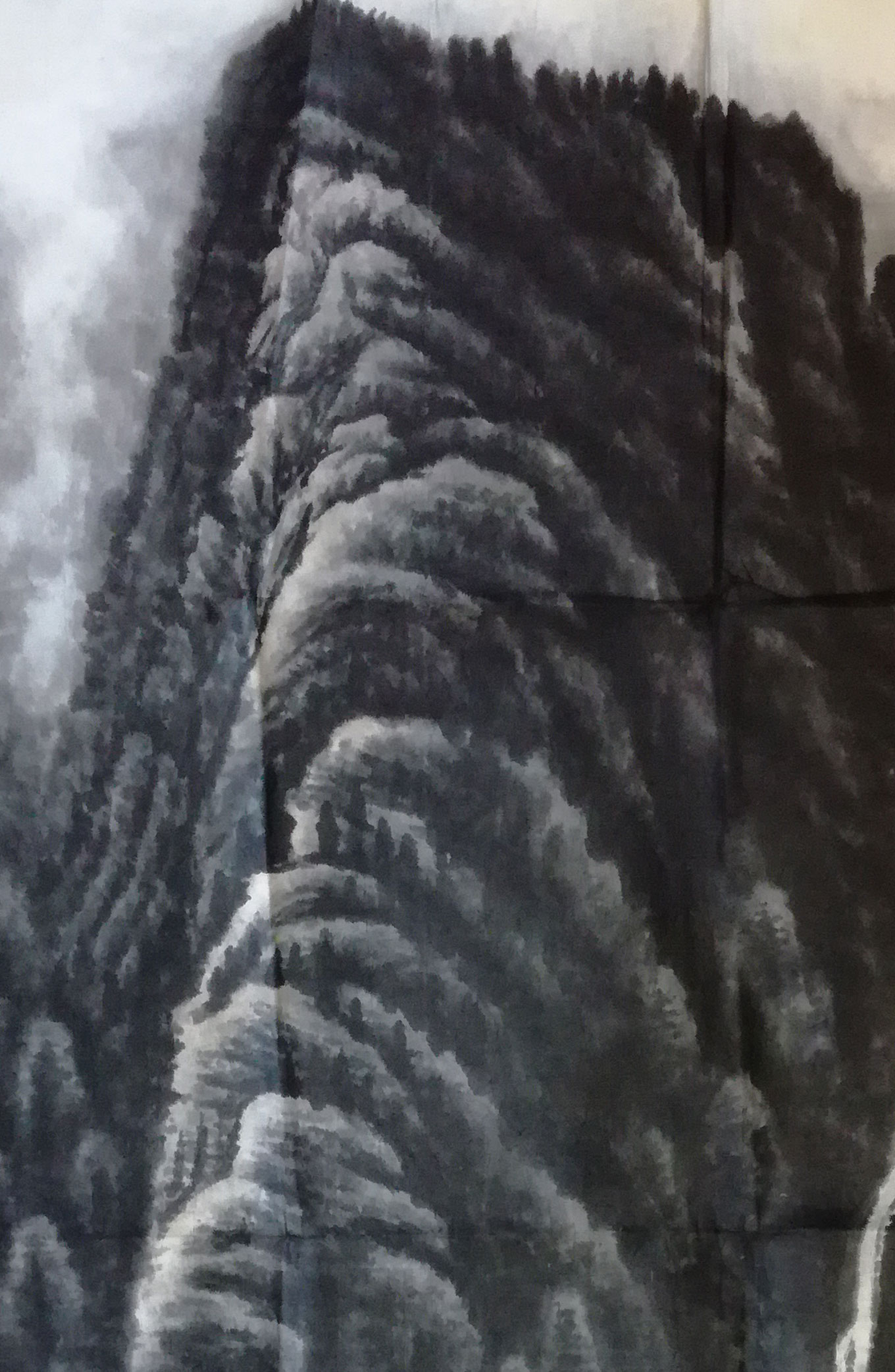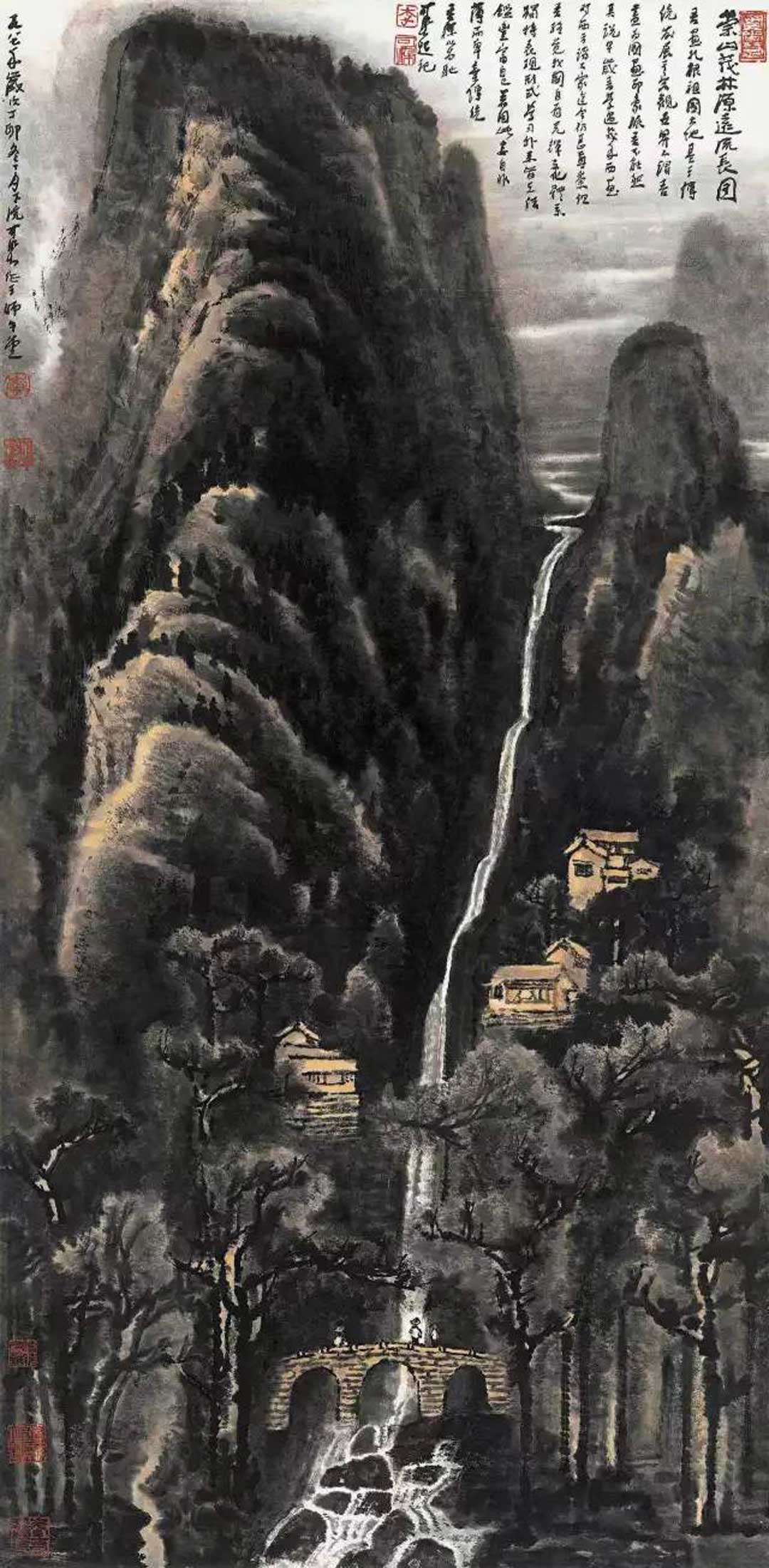 画作采用画家晚年最常见的满幅式构图,充满范宽式全景山水的力量。层层积墨铺就的乌黑巨峰扑面而来,充满画面,颇为震撼。主体山川高大巍峨,静穆壮丽,山石的外轮廓呈几何状,层层推远;山石左侧沐浴于光照中,右侧则处于阴影里,山下的树木以重墨画出,与山峦的阴影处连成一片,以此衬托瀑布;一道细长的流水从远处的高原蜿蜒而至,汇集在山谷中形成瀑布,倾斜而下,在峡谷深处又被零落的山石分离成数道水流。在两峰夹峙的山谷里,一条月光下的银链,蜿蜒伸向不可知的深邃……中国水墨这条古老长河源远流长……