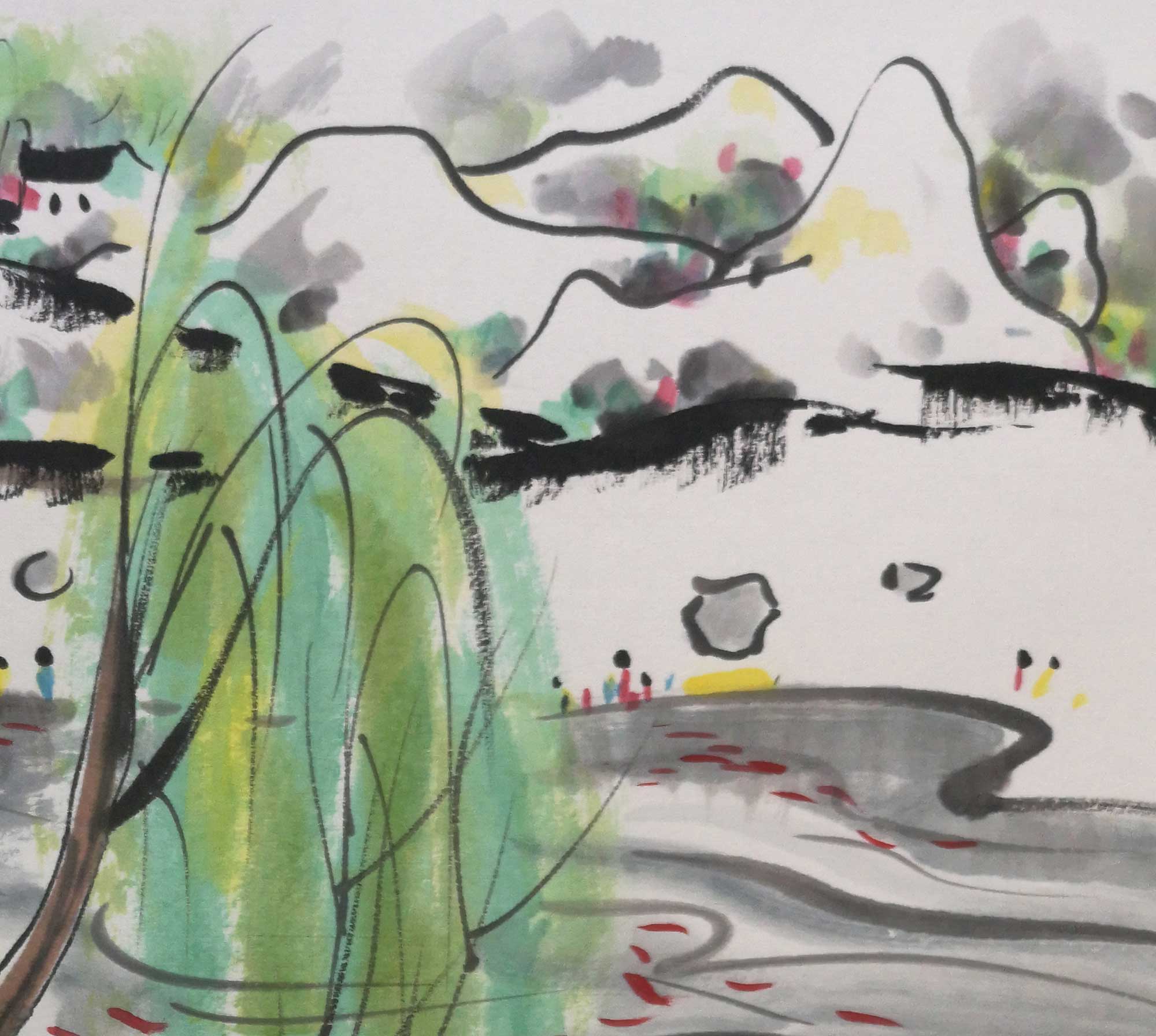 色彩上以黑、白、灰为主色调,近景的回廊和远景的房舍,其屋顶均以大笔水墨挥洒写出,笔墨淋漓酣畅,之后再以重墨勾出屋脊和翘起的飞檐,各种块面和飞扬婉转的曲线相映成趣。大小不等、形状不一的墨块层层推远,交错纵横,构成了深远而丰富的空间效果。穿插于几何块面之间的柳树、廊柱、行人和游鱼均以具象描绘。