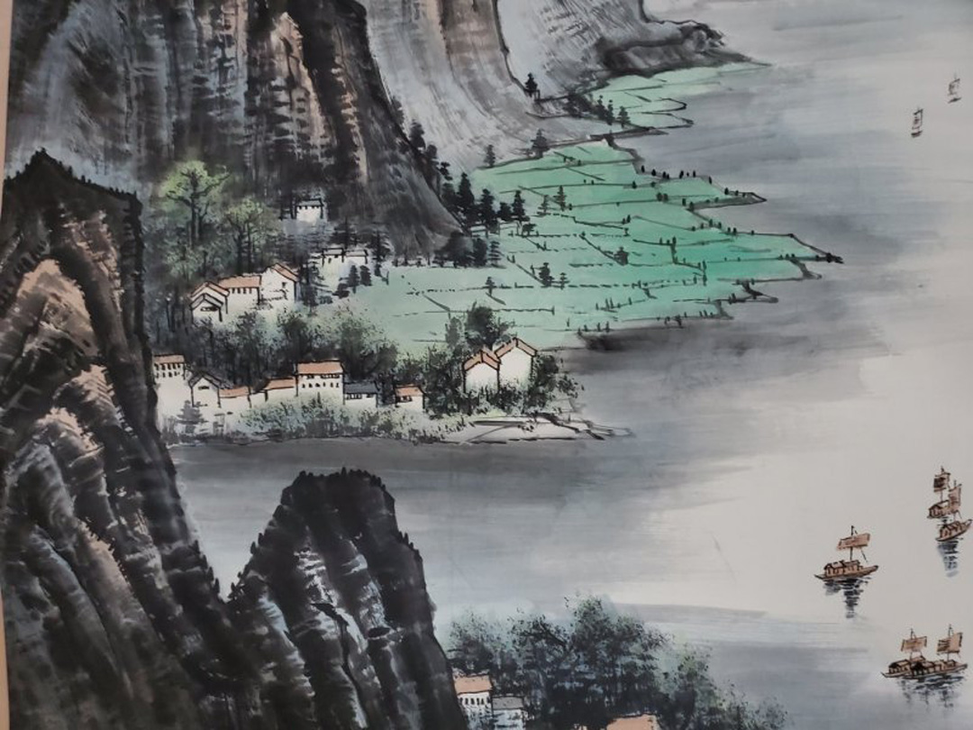 此幅《漓江山水甲天下》给人境界辽阔,江山无尽的感觉。从整体布局看,视野流动自由,不受传统程式构图的限制,通透式的视线构架,给人视觉的纵深感。山峰体势排列,起伏动盈,有争有让,前后主次,浓淡虚实互相穿插呼应。山中林木苍翠,掩映着村舍人家。水面高光处的留白处理显得恰如其分,近景和中景处赭石色的船帆排列错落有致。近景处嫩绿色的水田春意浓浓,与黑色的山峦形成强烈的对比。山体轮廓方中有圆、圆里有方,彰显了漓江山水的稳定和宏伟的气势。
