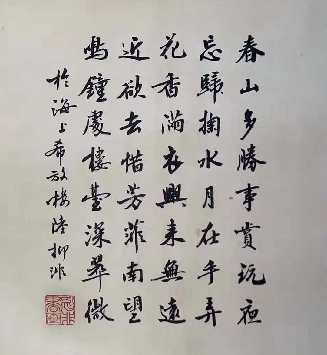 1.山上飞泉万斛珠,悬崖千丈落绝通。途已至樵,径行不碍,似有人声听却无。吴作人。钤印:吴作人印。2.初疑夜雨忽朝晴,乃是山泉终夜鸣。流到前溪无半语,在山做得许多声。人在非晴非雨天,船行不浪不风间。坐来堪喜还堪恨,看得南山失北山。钱君陶。钤印:钱君匋。3.春山多胜事,赏玩夜忘归。掬水月在手,弄花香满衣。兴来无远近,欲去惜芳菲。南望鸣钟处,楼台深翠微。于海上希放楼陆抑非。钤印:抑非书画。