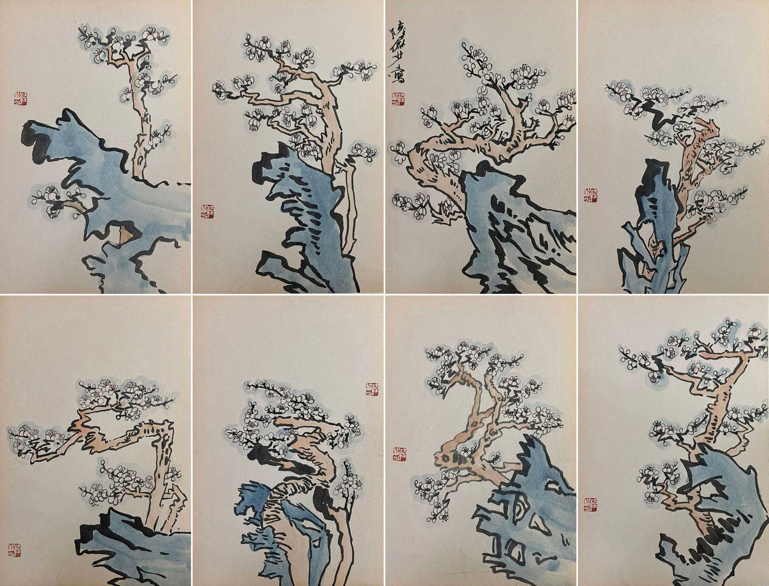 陆俨少(1909~1993) ,名砥,字俨少,以字行,改字宛若,上海嘉定人。从冯超然习国画。为一代艺术大师。工诗文,善书法,尤精山水,间作花卉、人物,也多妙笔。陆俨少成就最高的是山水。山水之余,他也画花鸟,而且画得最多的是梅花。下面从庋藏多年其数百件作品中悉心甄选谨献陆俨少花鸟画册页精品《梅石图》八开,以飨藏家。非专业拍照,图片仅供参考,所有藏品信息以实物为准。