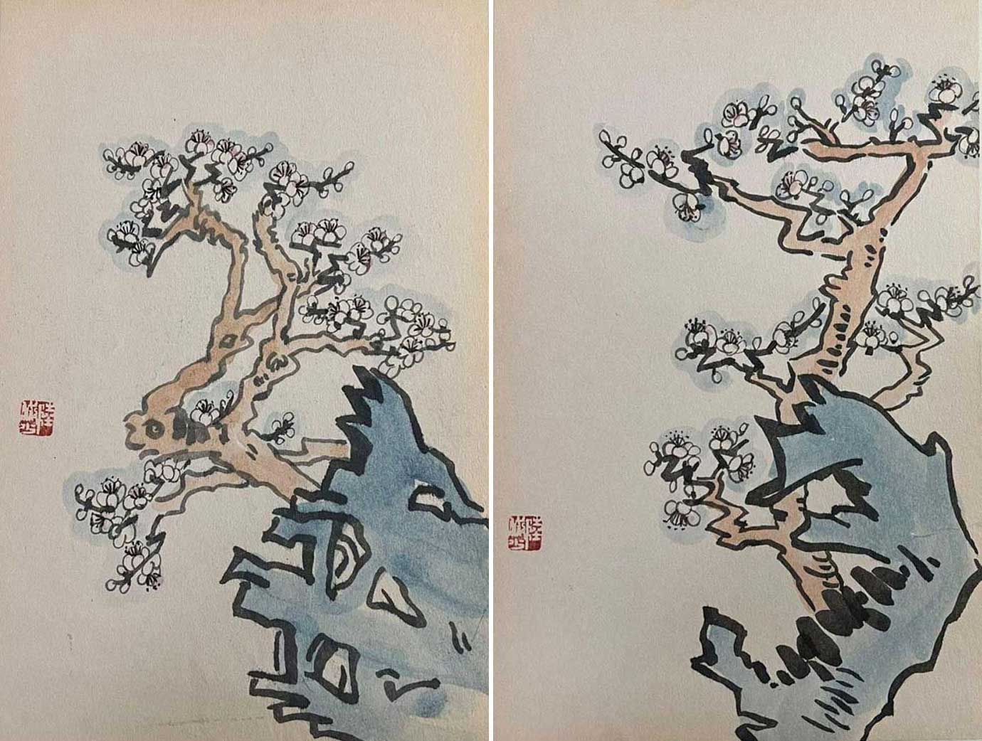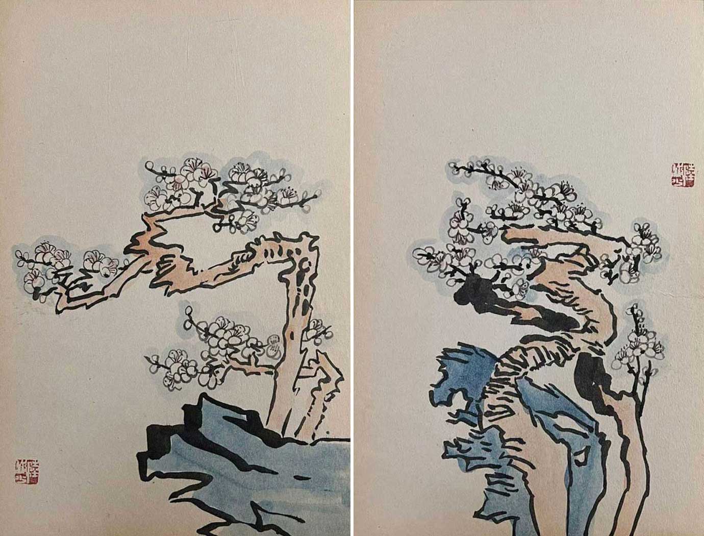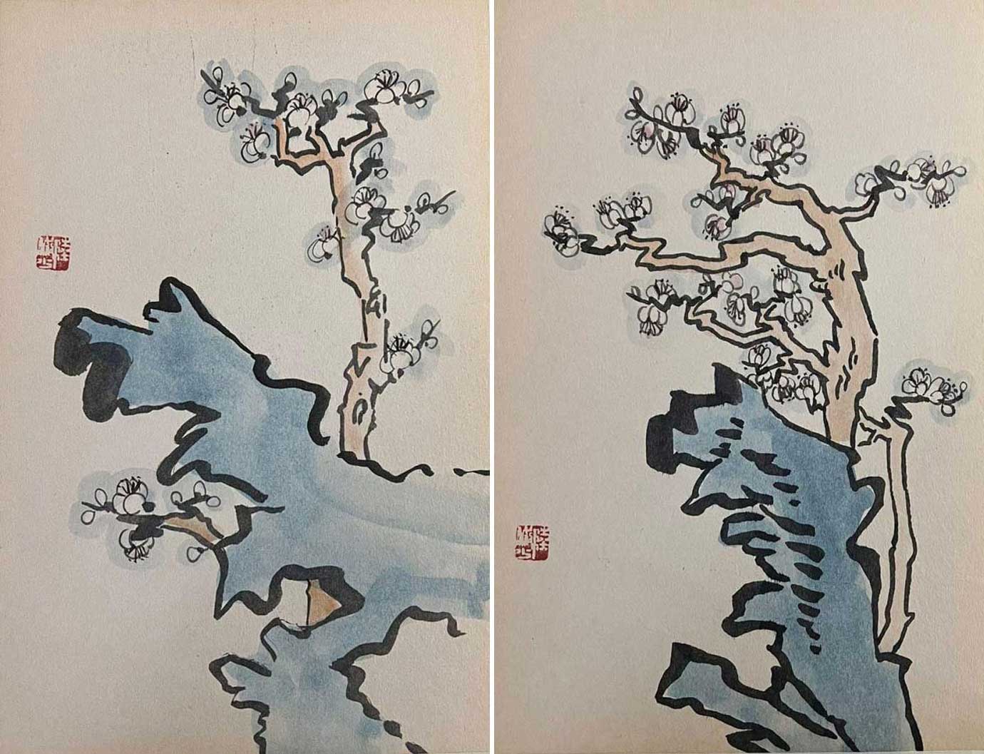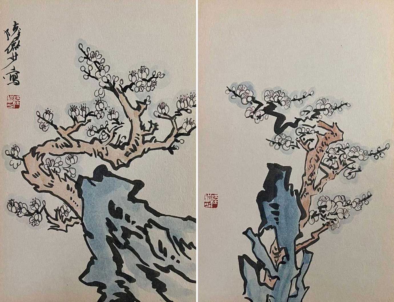 此册八开,无年款。用笔老辣浑厚,为晚年笔墨圆熟时期的作品。笔墨简练概括,风格自然天成,气象宏大;咫尺之间写梅开万里,山石耸立,笔墨飞动。
