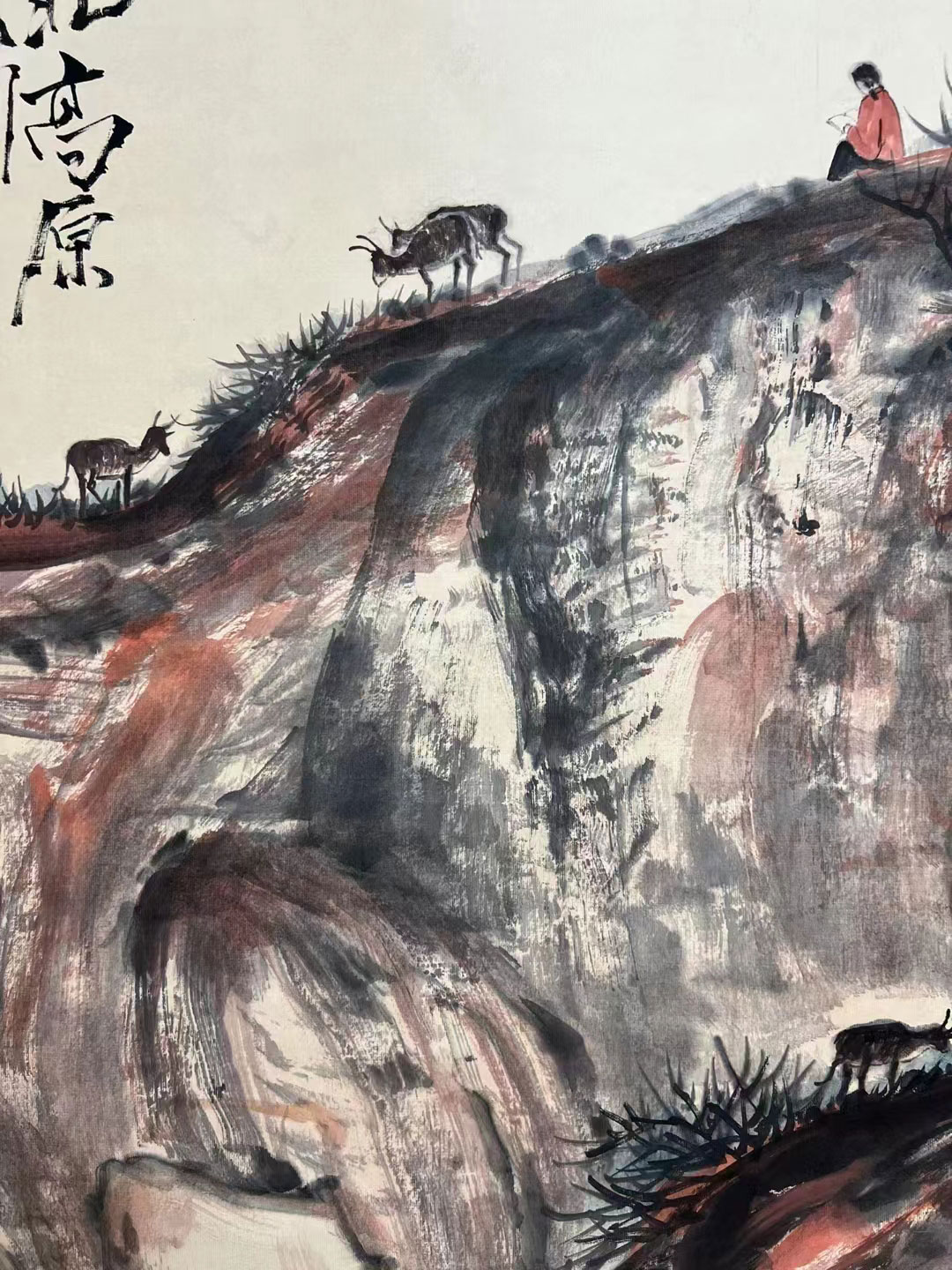 其笔触中既有石涛“我自用我法”的写意精神,又融入延安时期革命美术的雄强气质,成为中国画从文人趣味向现代性转型的关键节点。画面以浓重焦墨勾勒山崖轮廓,同时融入朱砂、赭石等矿物颜料,通过干涩笔触与色块堆叠,形成厚重粗粝的质感。例如崖壁的暗部以焦墨皴擦表现肌理,阳面则施以淡赭石渲染,既强化山体体积感,又暗合黄土高原的地域色彩特征。这种“墨色为骨,淡彩为肉”的技法,既保留传统水墨韵味,又突破单一墨色的视觉局限。《高原放牧图》通过色墨交融的技法,将黄土高原的地域特质转化为兼具写实与象征的艺术语言,成为石鲁突破传统文人画色彩体系的重要实践。