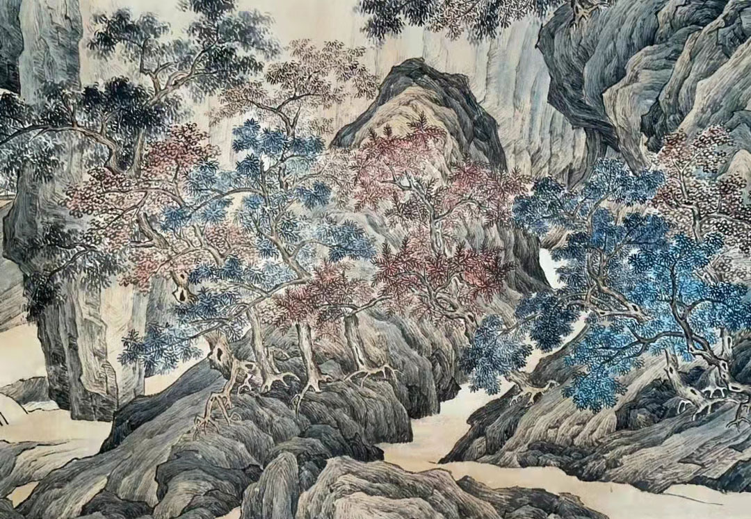 在引领吴门画风的明四大家中,唐寅以其坎坷传奇的一生,才华绝世而名满天下。唐伯虎对南北画派、南宋院体及宋元文人山水画诸大家的构图和笔墨技巧兼收并蓄,融会贯通,逐渐形成自己笔法严谨雄浑、风骨奇峭的风格。布局严谨整饬,造型真实生动,墨色淋漓。画风用笔绵密细劲,苍润秀逸。画中以特有的『北骨南韵』笔法,将斧劈皴的刚劲与披麻皴的柔润熔铸一体。整图全然体现了唐寅在山水画创作上吸收宋元诸家、融合吴门风格的成熟语言,是为巅峰之作。