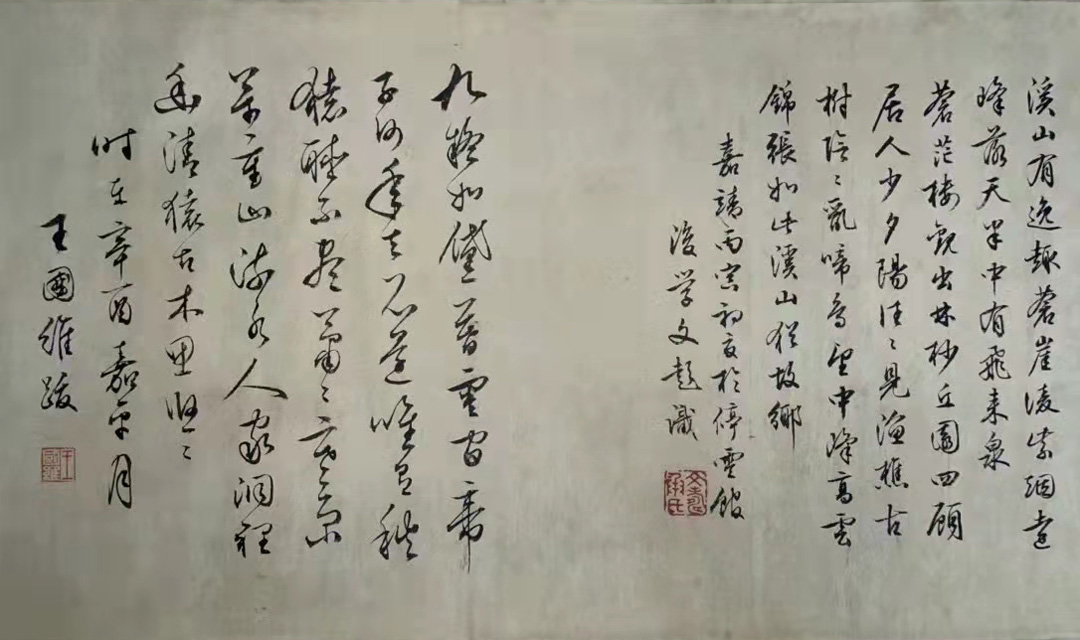 1.溪山有逸趣,苍崖凌紫烟远峰落天半,中有飞来泉。苍茫楼观出林杪,丘园四顾居人少。夕阳往往见渔樵,古树阴阴乱啼鸟。望中峰高云锦张,如此溪山犹故乡。嘉靖丙寅初夏于停云馆。后学文彭识。钤印:文壽承氏。