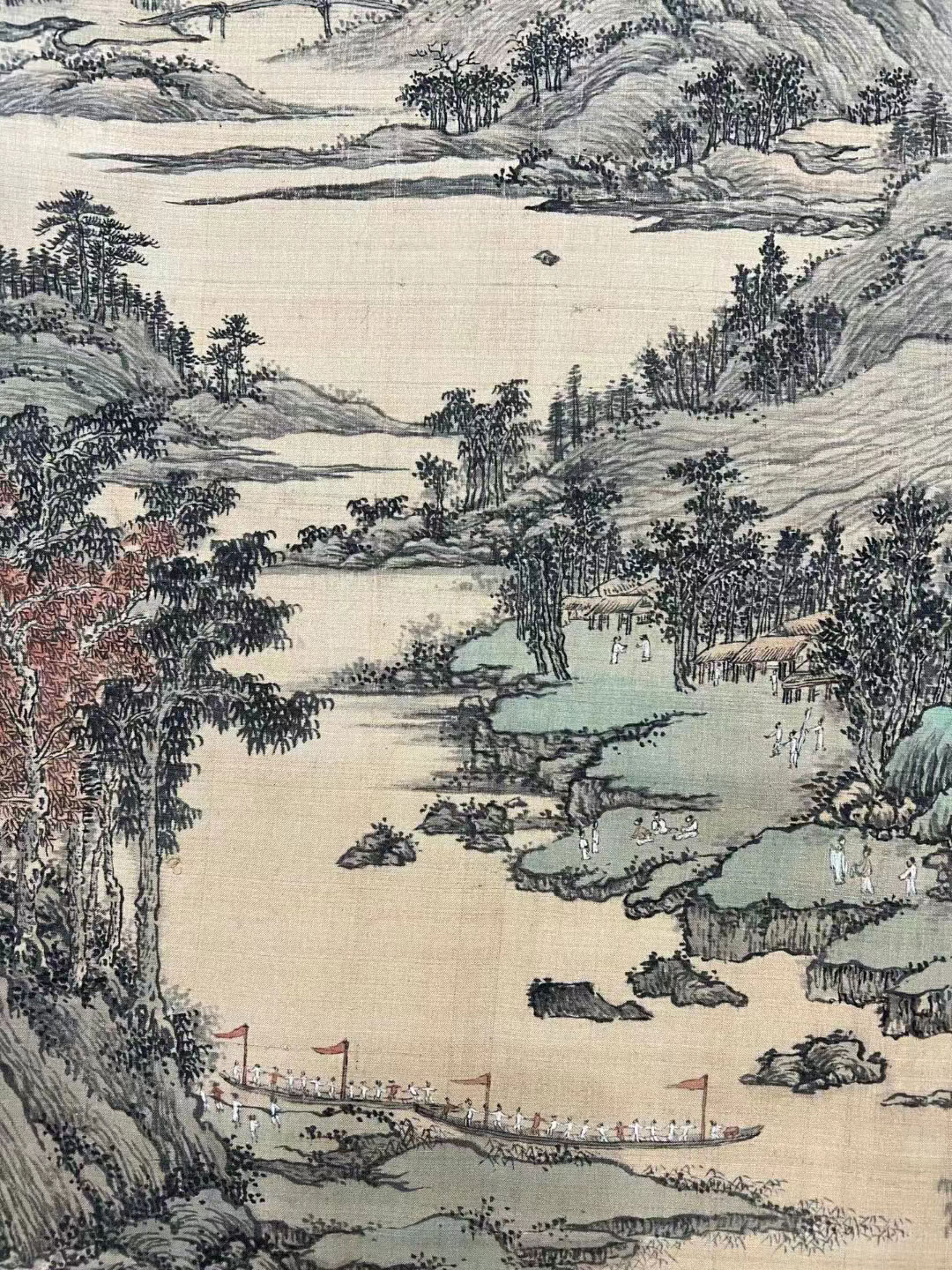 此图作于一七一三年,描绘了清初画圣王翚晚年隐居虞山的生活场景,展现了清初正统派绘画的集大成之风。这幅画作是诗画结合的典范,以唐解元题画之诗,拟北宋僧人惠崇笔意,合王翚秀润之笔,共成一件表现江南水乡恬淡生活的小青绿山水佳构。