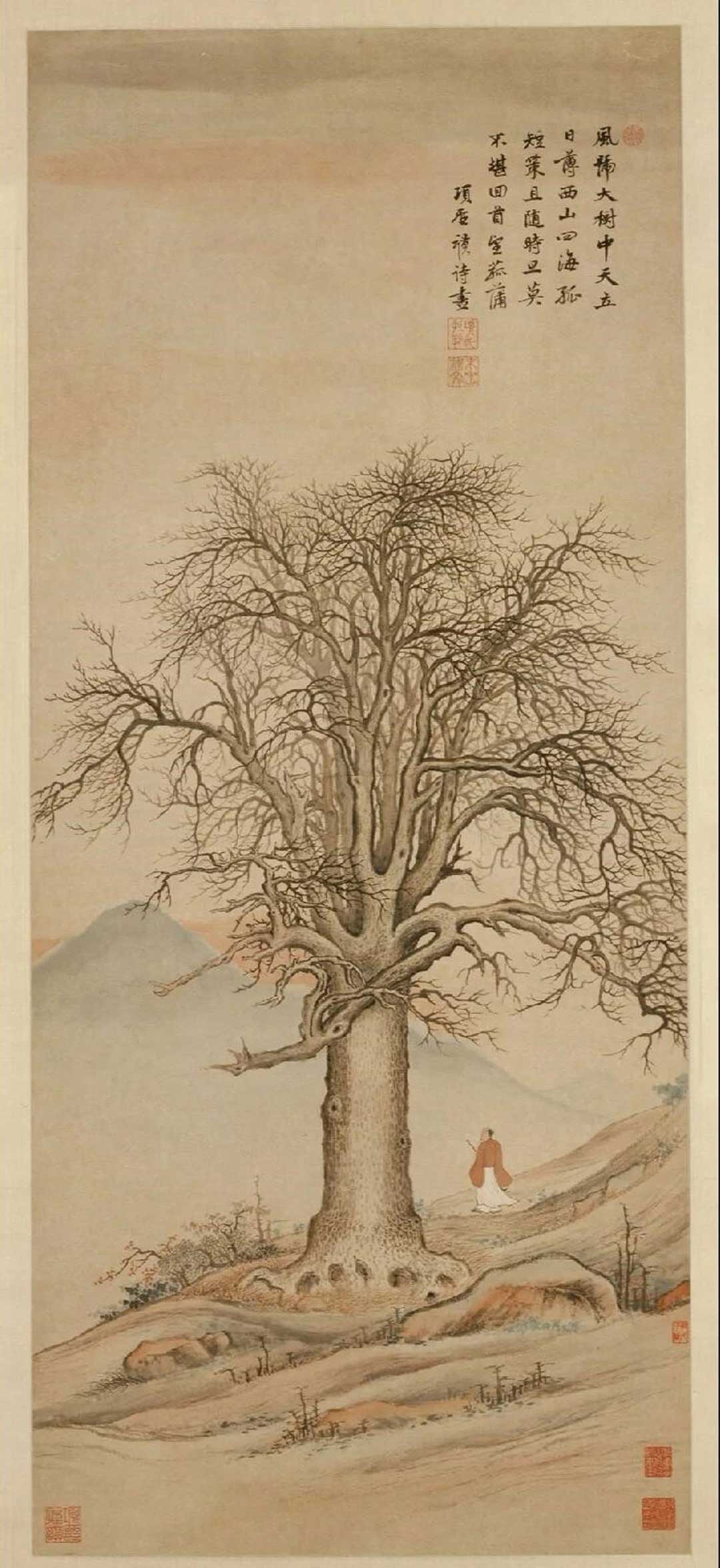 题跋:风号大树中天立,日薄西山四海孤。短策且随时旦莫(同暮),不堪回首望菰蒲。项圣谟诗。