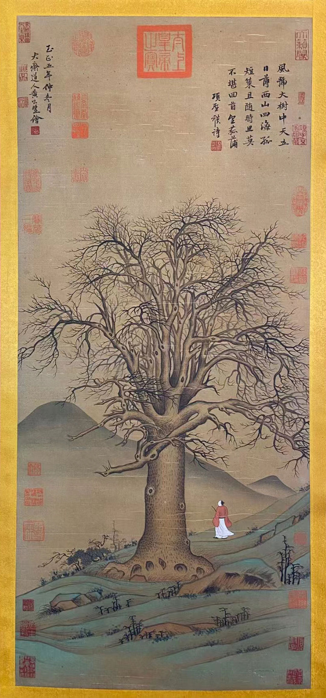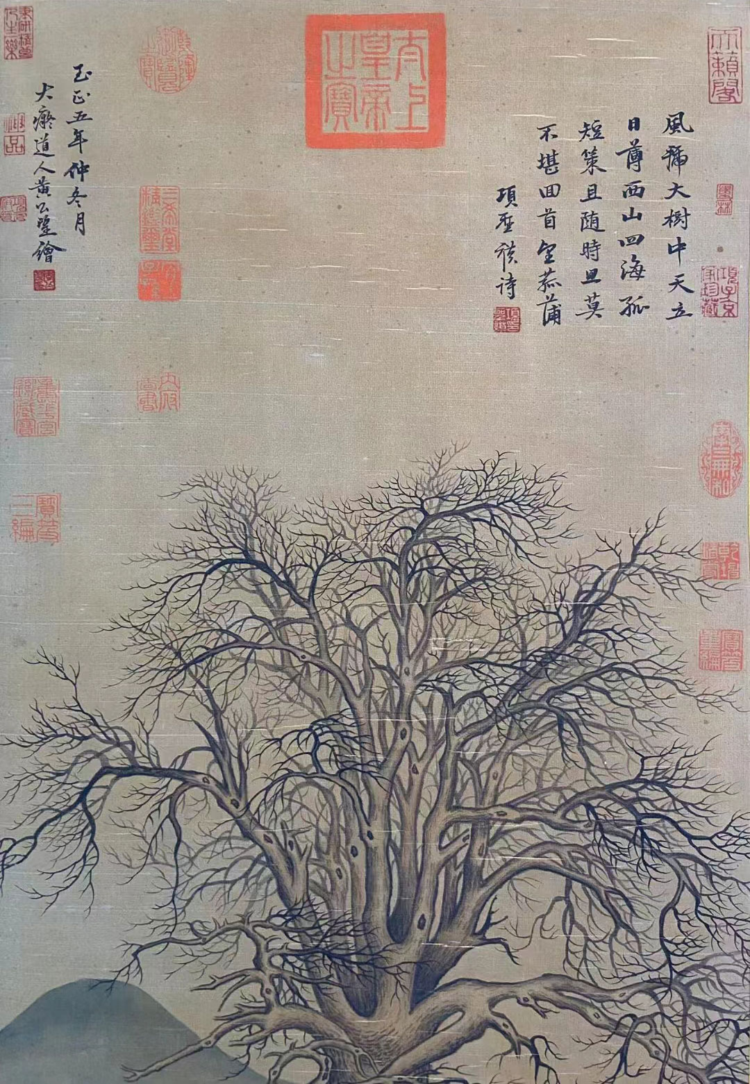 黄公望在《枯木高逸图》中通过枯木与高士的意象组合,传递隐逸超脱的士人精神。这种艺术表现与赵孟頫倡导的古意一脉相承,又融入了个人对自然与生命的深刻体悟。最后值得一提的是,同样很有民族气节、经历亡国之痛的项圣谟的题跋深刻寄托了其作为明遗民的家国情怀与精神坚守,这与画作意境完美融合,画中有诗,诗中有画,两者相得益彰,宛如天作之合。