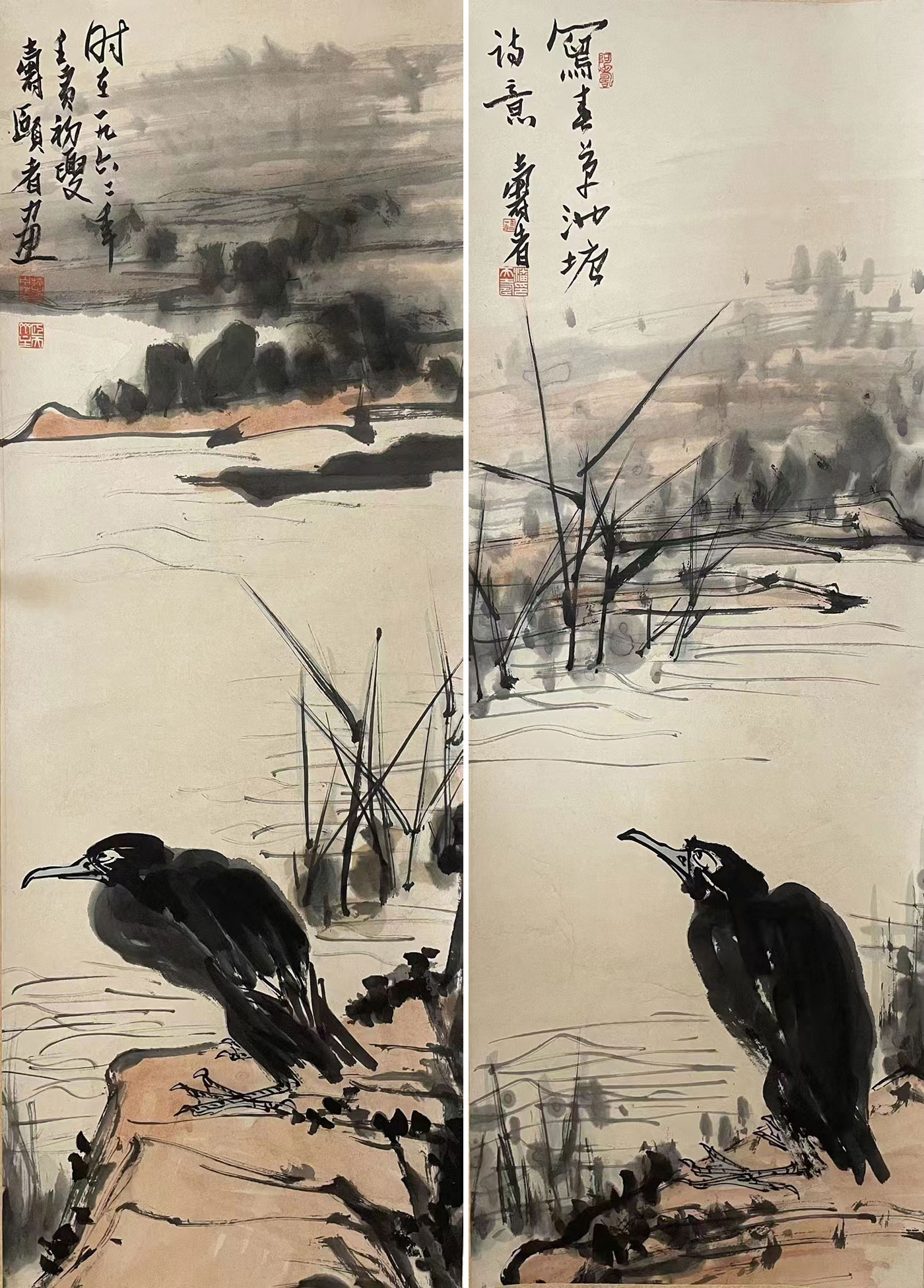 二十世纪五十年代中期到六十年代中期是潘天寿艺术创作的全盛时期。在这相对平静的十年中,潘天寿在旧传统和新时代之间找到了可贵的连接点,创作出一批苍古高华、沉雄阔大的国画巨作。作于六二年的《池塘双屏图》即出自这一时期,这年的潘天寿创作热情高涨,在杭州和北京两地举行盛大个展,都受到热烈欢迎。