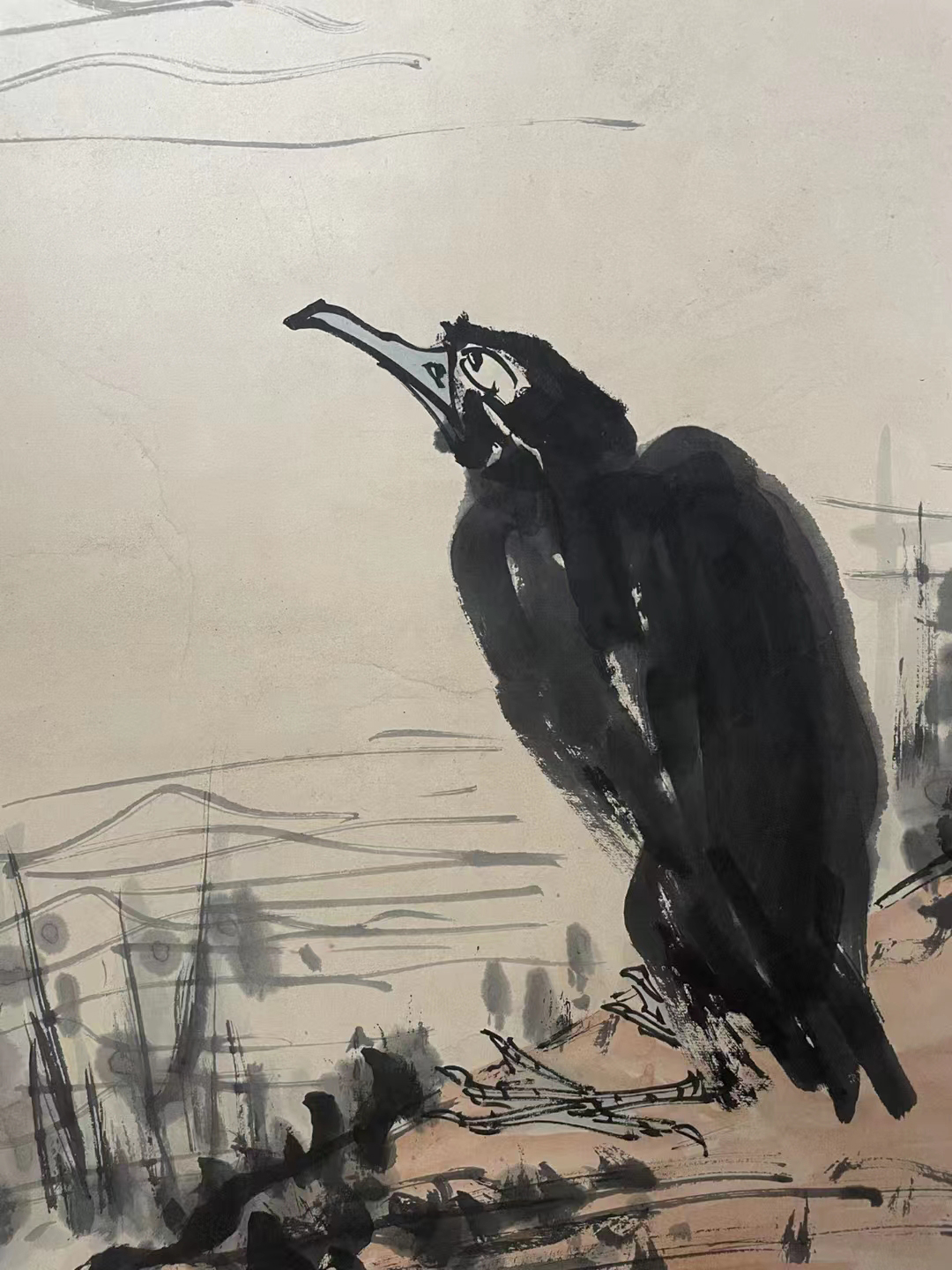 潘天寿鱼鹰题材及绘法受到八大山人的影响,继承其用线简洁洗练、用笔不落窠臼的创作趣味,潘天寿更立足于抓住景物稳静恒久的状态,着意于铸型,有着雄浑奇崛,朴茂雅野的独特气质。池塘中,鱼鹰伫立石上,并翅远望,似乎将要随时冲破画面。鹰爪尖利如锥,钢劲锋锐,目光如炬,面朝着前方空旷无垠的水面。鱼鹰为鹗的通称,又称鸬鹚,栖水边,善捕鱼,体羽黑色,有着金属光泽,脚大而黑,经渔民驯化后是潜水捉鱼的好帮手。这里生存于春草池塘的鱼鹰,等待捕食猎物的情状被绘制得出神入化。