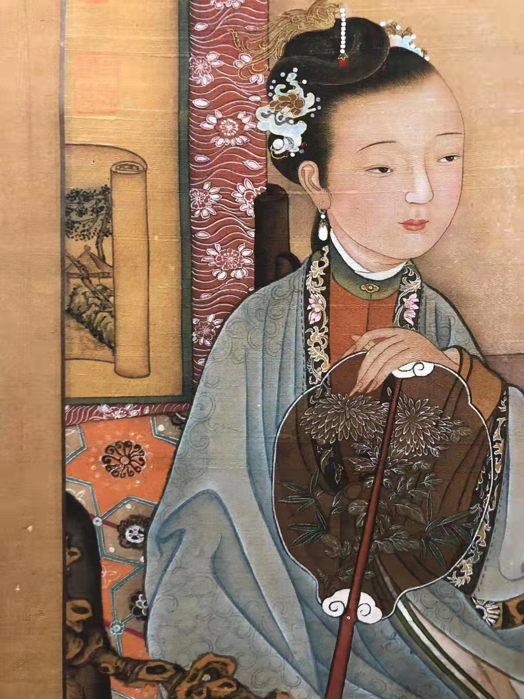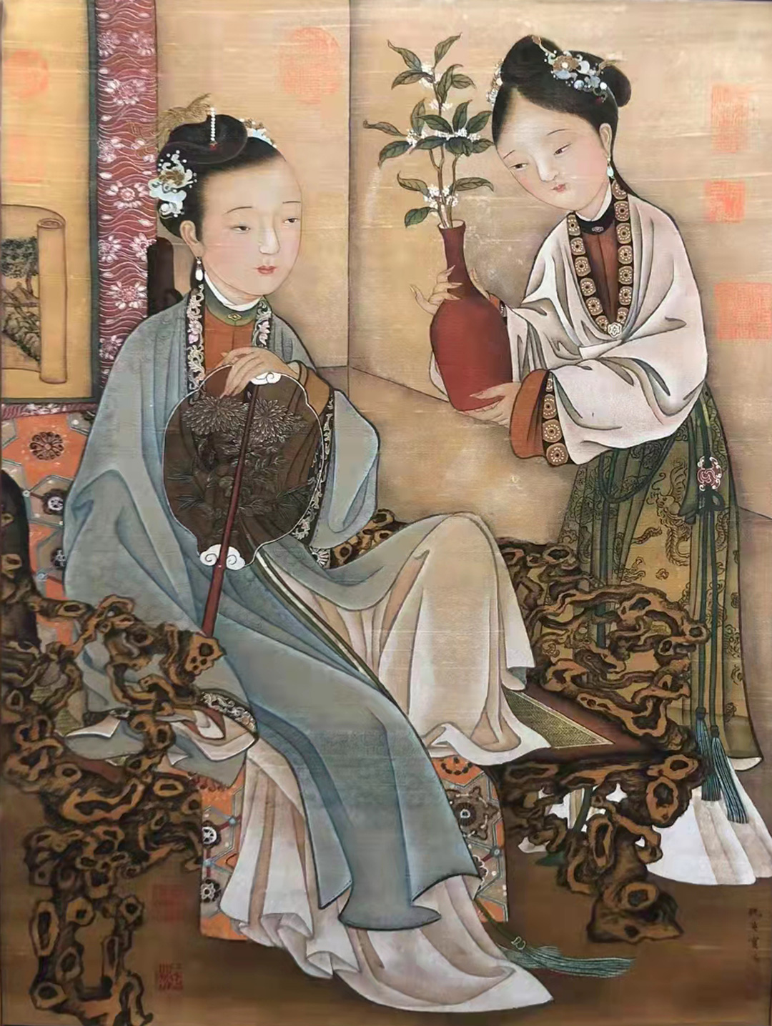 画中仕女一坐一站,主次分明的构图,是仇英匠心独运的“主从叙事”典范。闺秀居中安坐,奠定了其视觉与叙事核心的地位;丫鬟侧立侍奉,动态恭敬,自然构建了古典社会的主仆秩序与画面稳定的三角形构图。这种布局并非僵化,而是通过人物间的眼神与动作呼应(如丫鬟低垂的眼神朝向主人或花瓶),形成内在的叙事联系,仿佛在讲述献花或侍主的片刻宁静故事。将人物与屏风、挂轴等陈设有机结合,营造出一个具体、可感、可居的闺阁空间,这正是仇英将人物置于生活场景而非虚空背景的高明之处。