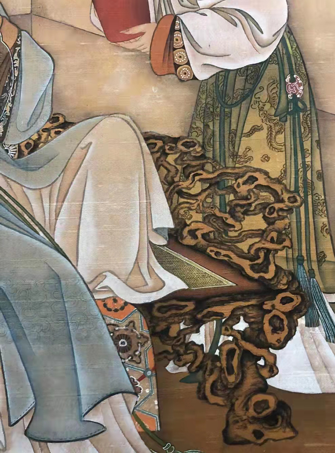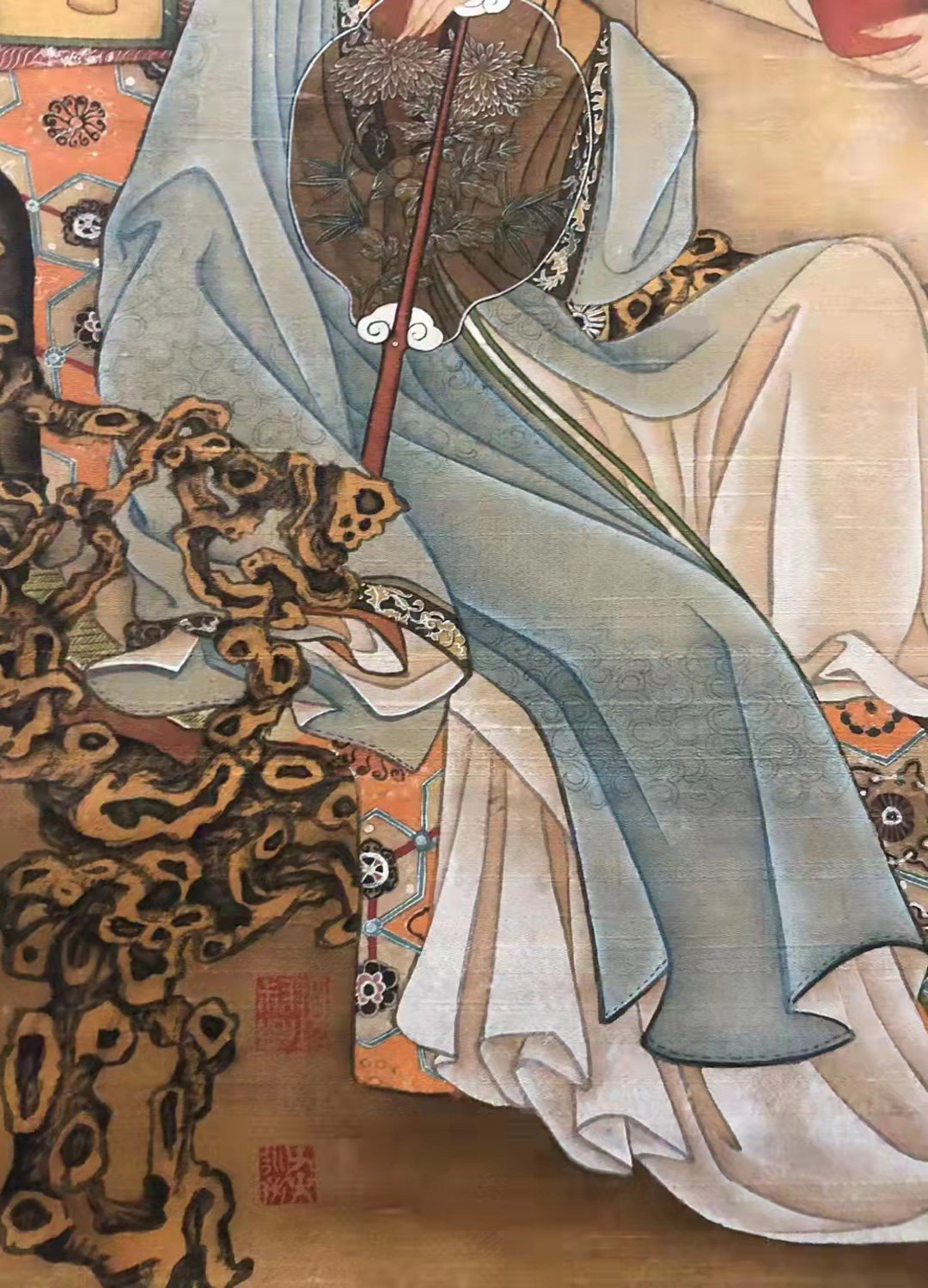 画中闺秀的蓝灰长袍雅致沉静,奠定了主人端庄的身份与画面主色调。丫鬟的绿裙与之形成柔和对比,而手中插花的红花瓶则成为画眼——这一点醒目的红色,瞬间点亮了整体偏冷、雅的色调,是仇英“在妍丽中求雅致”的典型手法。这抹红色并非艳俗,而是平衡画面、赋予生机的关键。通过不同色彩,仇英也暗示了材质。蓝灰的绸缎、素色的棉麻、绿裙的丝质感以及红瓷花瓶的光泽,在雅致的设色中得以微妙区分,展现了其作为顶级职业画家掌控材料与视觉感受的高超能力。