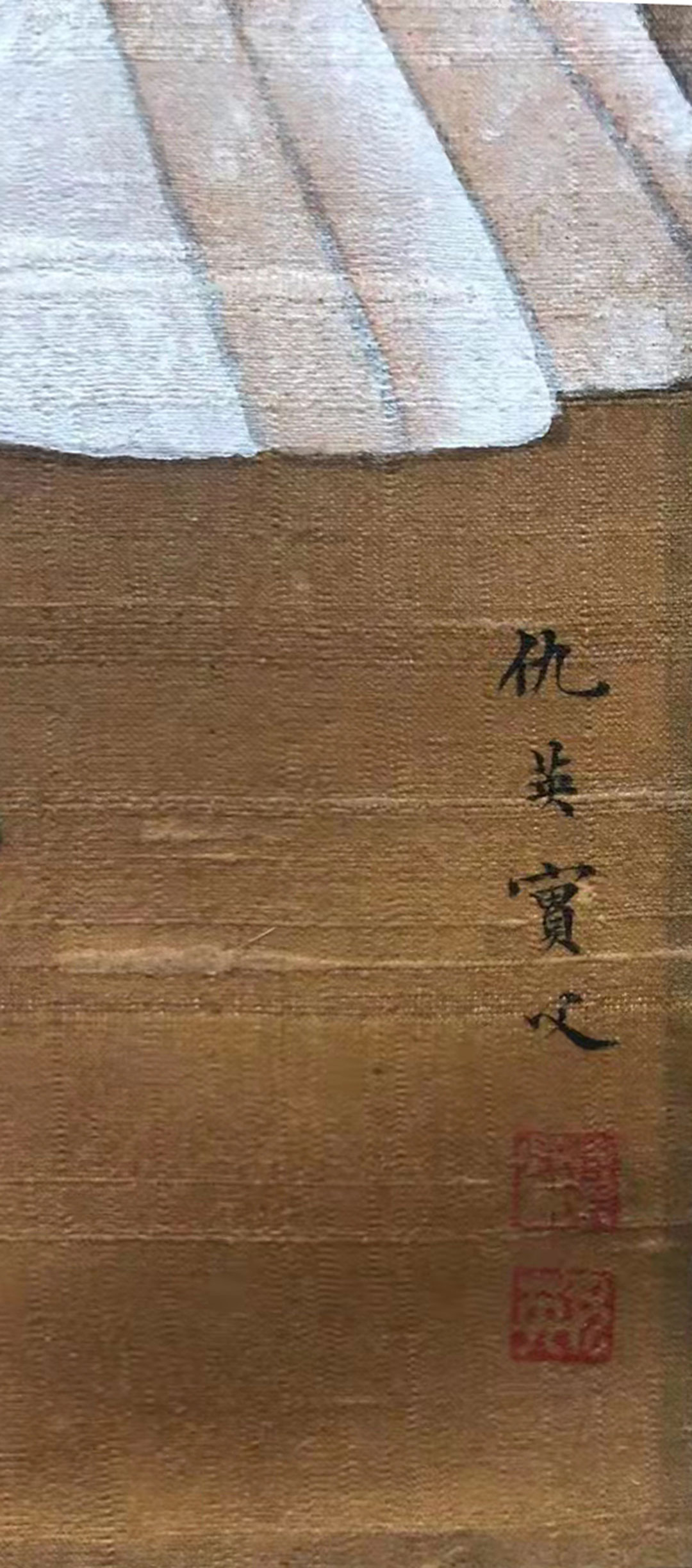 除钤有乾隆五玺外,此遗珍的第一位收藏者为画者同时代的项墨林,为此图的可靠性作出了有力的旁证。加之吴湖帆曾经总结过鉴定仇英书画的诀窍,即仇英不擅书款,而多请人代笔,如果是隶书款便是文彭书,如是楷书款便是文嘉书;而且仇英字实父,“實”字中间毌字两侧不穿出,父字收笔一捺亦劲挺有力。另外,英字的“艹”部一横呈现出分离之势,最后,父字的书写尤为特别,其上部并非常见的“八”字撇、点组合,而是采用提、点结合的方式,形成相向的牵丝点,笔断而意连,且“父”字的捺笔极为浑厚,与周围笔画形成鲜明对比。即吴湖帆所言的“父字收笔一捺亦劲挺有力”。凡此种种,仇英《深闺瓶花图》为真迹无疑,今日公诸于世,实为难得之珍品也。