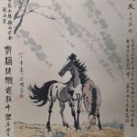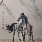 徐悲鸿以画马着称于世,泼墨写意或兼工带写,塑造了千姿百态、倜傥洒脱的马,或奔腾跳跃、或回首长嘶,或腾空而起、四蹄生烟。他画的马既有西方绘画中的造型,又有中国传统绘画中的写意,融中西绘画之长于一炉,笔墨酣畅,形神俱足。下面为本站藏品,徐悲鸿《柳阴双骏》。1947年作品。手工老裱带实...