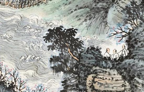 作者于高大山川间绘屋舍数间,画中高士或策杖前行,或立足原地眺望远方,或面对面晤谈,不禁让人联想到唐代诗人王维“行到水穷处,坐看云起时”的诗境,完美地切合了萧愻一以贯之的隐逸主题。