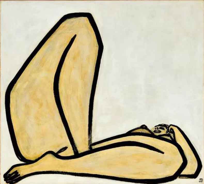 诞生于1965年4月的《曲腿裸女》是他最具代表性的艺术作品之一:从勒维别墅展览开始,《曲腿裸女》已是开幕邀请函之封面;1977年,巴黎传奇画商暨常玉重要藏家希耶戴在其画廊举行“礼赞常玉”展览,本作亦作为海报。1990年代以后,无论是艺术家油画全集,抑或其他重要出版,《曲腿裸女》都不曾缺席,成为经典。