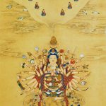 清代丁观鹏所绘的宝相观音图。图绘千手宝相观音一尊,各手分别持小斧、莲花、宝剑、弓箭等各种法宝;头上祥云朵朵飘荡,云中托出小佛十尊,花朵飞扬。观音面容和手臂作多层烘托,有较强的立体质感。说明作者在继承传统技法的同时,也吸收了西洋画的明暗、透视等特点,形成了自己的风格。 观音,全称“...