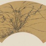 此图绘兰花与荆棘相伴而生的田野风光。文氏以挥洒豪放的笔墨,表现兰叶摇曳之美;以迟缓的中锋运笔,表现荆棘的坚韧而多刺。在一件作品中将不同的物象施以迥异的笔法,由此可见文氏所具的高超绘画技法。 《兰花图》扇页,明,文徵明绘,金笺,墨笔,纵16.8cm,横50.9cm。 扇页有自题:“...