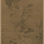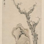 是图以古拙奇特的造型绘拳石耸立,旁伴一株被截去诸多枝干的老梅树,树上几朵梅花绽蕾展瓣。构图简约洗练,并注重物象间的相互衬托与对比。画石用线勾出圆润的外形,再以淡墨渲染。画梅则用浓、枯墨笔勾勒,线条古拙方硬,具金石韵味,体现了老梅饱经沧桑的古木气息。 《梅石图》轴,明,陈洪绶作,纸...