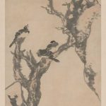 本幅表现隆冬时节,4只落寞的寒鸦在残石败枝上栖息的情景。寒鸦的羽毛先以淡墨晕染,趁湿在淡墨上罩以浓墨,浓淡墨交融处显现出羽毛柔软、细密的质感。鸟的眼眶为一笔圈成的椭圆形,靠近上眼眶处以重墨点睛,一付“白眼向人”的神色顿现笔底。鸟儿孤傲不驯的神态最能体现作者坚韧倔强、磊落不羁的个性...