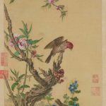 此《花鸟图》笔法精工细腻,色调绚丽多彩,造型写实生动,注重描绘禽鸟翎毛的质感、花叶的阴阳向背以及明暗层次的变化,具有鲜明的西洋花鸟写实画的风格。 《花鸟图》轴,清,郎世宁绘,绢本,设色,纵63.7厘米,横32.3厘米。 本幅款署:“臣郎世宁恭画。”钤“臣世宁”白文印、“恭画”朱文...