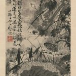 《墨荷图》轴,清,石涛绘,纸本,墨笔,纵90.2cm,横50.4cm。 图绘欣欣向荣的荷塘景色。构图疏密交错,通过荷叶、茨菰、莲蓬、蒲草间的相互掩映构筑出变化丰富的空间层次。用墨淋漓尽致,浓淡、枯润相生,显现出作者较强的笔墨把控能力。 本幅自题七言诗一首,款署:“大涤子邗上秋日写...