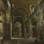 乔瓦尼·保罗·帕尼尼出生于意大利,他是意大利著名的画家,也是一位在罗马工作的画家和建筑师。《圣彼得堡内部》是室内绘画题材的作品,为乔瓦尼·保罗·帕尼尼1742年所画。画中展示了圣彼得堡内部豪华的装饰和宏伟的建筑结构,包括大理石柱廊、巨大的青铜灯和华丽的彩色壁画。这幅画是对18世纪...
