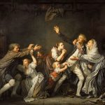 《父亲的诅咒》:格勒兹的这件作品描绘的是一位老父亲与儿子吵架的场景,老父亲坐在椅子之上,双手举起,异常的愤怒,儿子亦不甘示弱,家人忙着前来劝阻,母亲,妻子,儿女都加入劝阻的横列。每个人的神态动作各不相同,造型夸张而富有戏剧性。作者注重人物动势设计,忽略人物的面部表情所揭示的个性心...