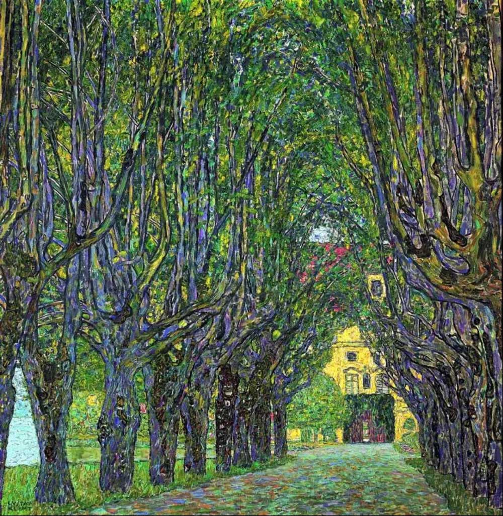 《加玛城堡公园的林荫道》英文名为“Alley in the park of the palace Cummer”,是维也纳分离派的画家古斯塔夫·克里姆特的作品之一。在画作中,他用清晰的笔触将树干绘出,营造出了极强的空间感,总是能给人眼前一亮的感觉。实际上,克里姆特是十九世纪席卷欧美的“新艺术”运动中三个巨大代表之一,也是争议最多艺术表现最复杂的一位。他是象征主义绘画中维也纳分离派的杰出领袖,是一位即具独特艺术个性,又以强烈民族风格见长的绘画大师,他的艺术创作曾引起了空前的赞美,后来却又受到激烈的抨击。只因他舍弃了传统的寓言与象征手法,而使用了更公然表达性欲的新颖表达方式,因此招来了更多纷扰。