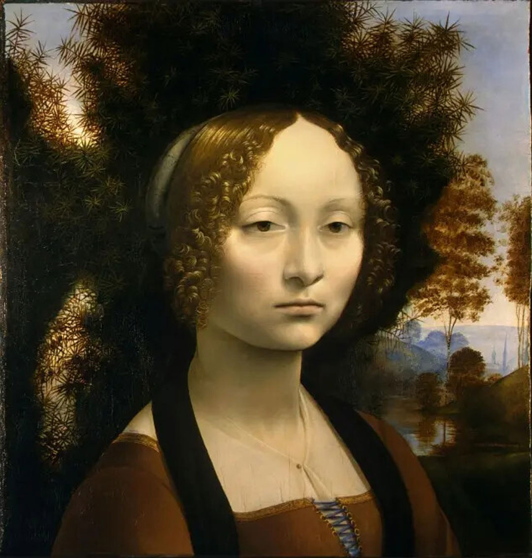 《吉内薇拉·班琪》是达·芬奇在佛罗伦萨时期唯一的肖像画。当时的少女在结婚时,习惯都会画一幅肖像画做纪念。据说吉内薇拉·班琪是一位女诗人。她额头饱满,眼帝低垂,目光忧郁,眉宇之间带着一丝淡淡的忧郁。她两眼冷漠的看着观众,整个脸庞似无表情,却栩栩如生。可惜这幅肖像画的底部因受损而遭致裁切,那部份可能是少女的手臂,这也给我们留下了无尽的畅想,有些人甚至认为,如果它的下半部分没有被裁切的画,这件作品有可能和蒙娜丽莎一样是一件惊世骇俗的作品。