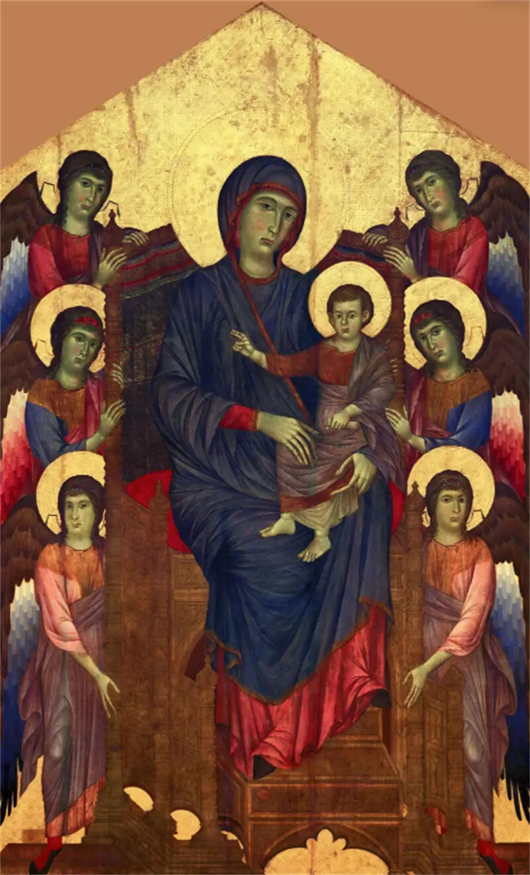 在这个图像中,圣母形象已较为生动柔和,加强了体态凸现的雕塑感,线条轻快有力,富于生气,宝座结构的表现也开始注意深远关系。圣母的周围,那些天使已不再是另一世界中的生命,他们僵直的影像在金色背景上像剪影般呈现着,在他们身上显露出与人类的孩子相似的特点和生命的运动。画面中央是一位端坐在宝座上的圣母玛利亚,她的脸庞祥和安详,手中抱着一个睡眼惺忪的婴儿耶稣。圣母的头上戴着一顶金色的皇冠,身穿一袭华丽的红色长袍,袍子上还绣着金色的花纹。她的脚下是一只踩在蛇头上的小天使,象征着对邪恶的征服。