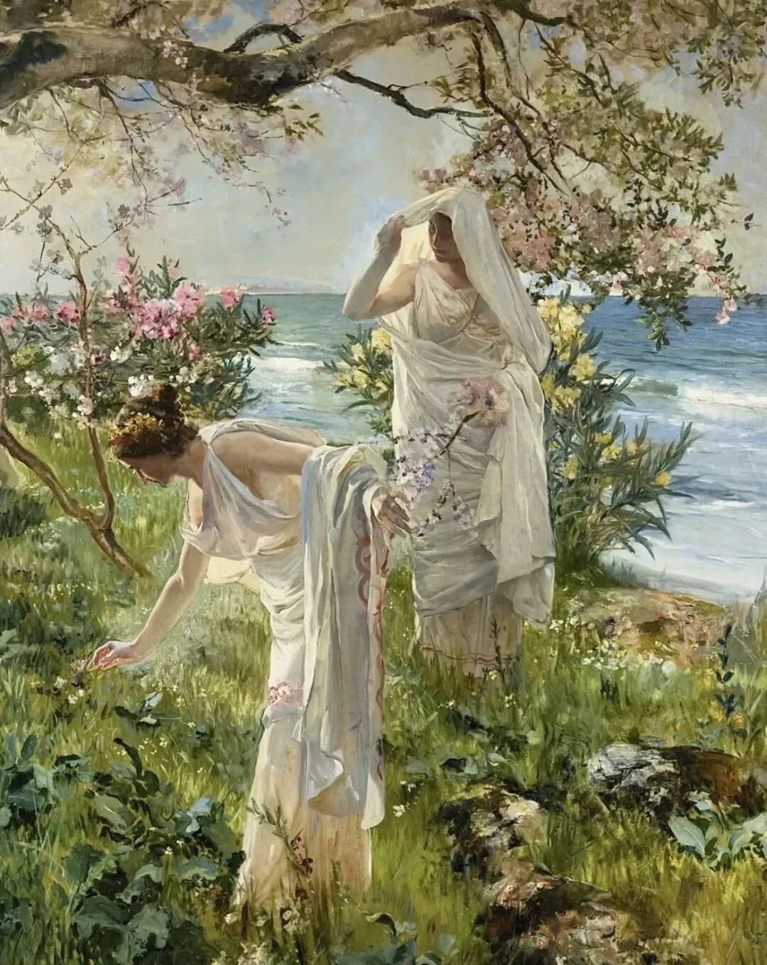 在《岸边的希腊女孩》中展现了一个阳光明媚、郁郁葱葱的地中海沿海环境,画面中充满了鲜花,还有两个在阳光下穿着优雅飘逸的白色纱裙的少女。画家尝试捕捉光线和颜色的精髓,用鲜艳明亮的色彩和流畅的线条表现了场景中少女们的柔美身姿和优美的动作。