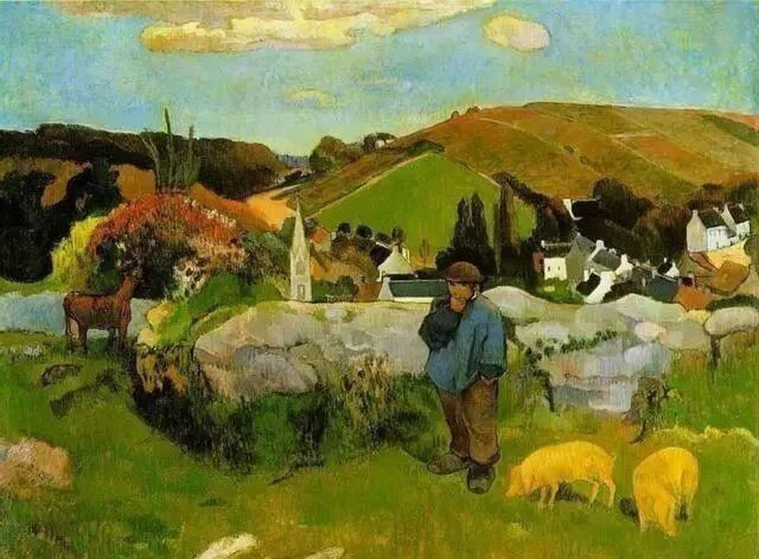 《布列塔尼的猪倌》中色彩的运用已经跟印象派有了很大的差别,印象派追求的是客观的描绘世界,描绘自己所看到的,但是这幅画中猪是黄色的,天空也有些许黄色,色彩对比更加明显,此时的高更已经慢慢的走向了后印象派,不像印象派一样客观描绘现实世界,更多的强调画家对客观世界的主观感受,这个时候的色彩已经不那么重要了。
