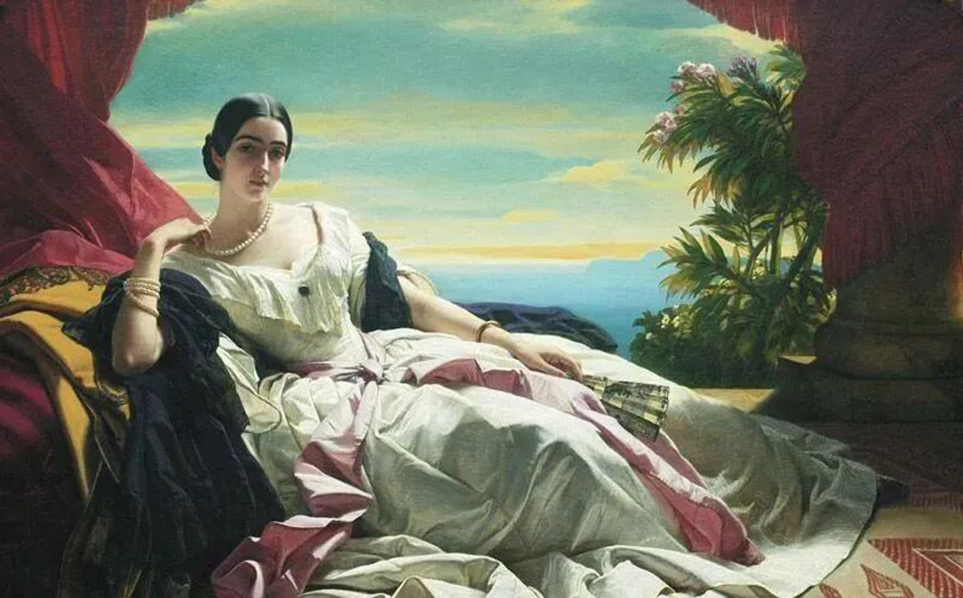 温特哈尔特的肖像画,每一幅都有着独特的魅力,这幅《列昂妮拉公主的肖像》,虽然不是他最为著名的画作,却是最让人眼前一亮的作品。列昂妮拉是俄国公主,1816年出生于莫斯科,后来嫁给了Sayn-Wittgenstein-Sayn王子。Sayn是一位德国伯爵的称号:当时德国由上百个大小公国统治,后来被普鲁士统一成为德意志,但是这些名称保留下来了。画中这位女士的全名是Leonilla Bariatinskaia,她身穿雪白的长裙,左手拿着折扇,右手轻撩珍珠项链,悠闲地倚靠着床脚并坐在地毯上。
