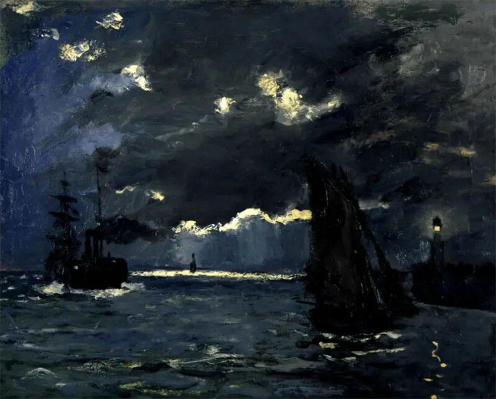 《月光下的航海图》是克劳德·莫奈在早期创作的一幅画作,描绘了法国诺曼底地区翁弗勒尔海港的夜景。画家运用了对比强烈的光线效果,让画面产生了戏剧性的效果。乌云遮盖了月亮,但月光在乌云边缘形成了明亮的光效,与大海反射的光线和灯塔的光束相呼应,成为画面中最亮的部分。海面上的船只只能看到模糊的轮廓和黑暗的阴影,与周围的光影形成了鲜明的对比。