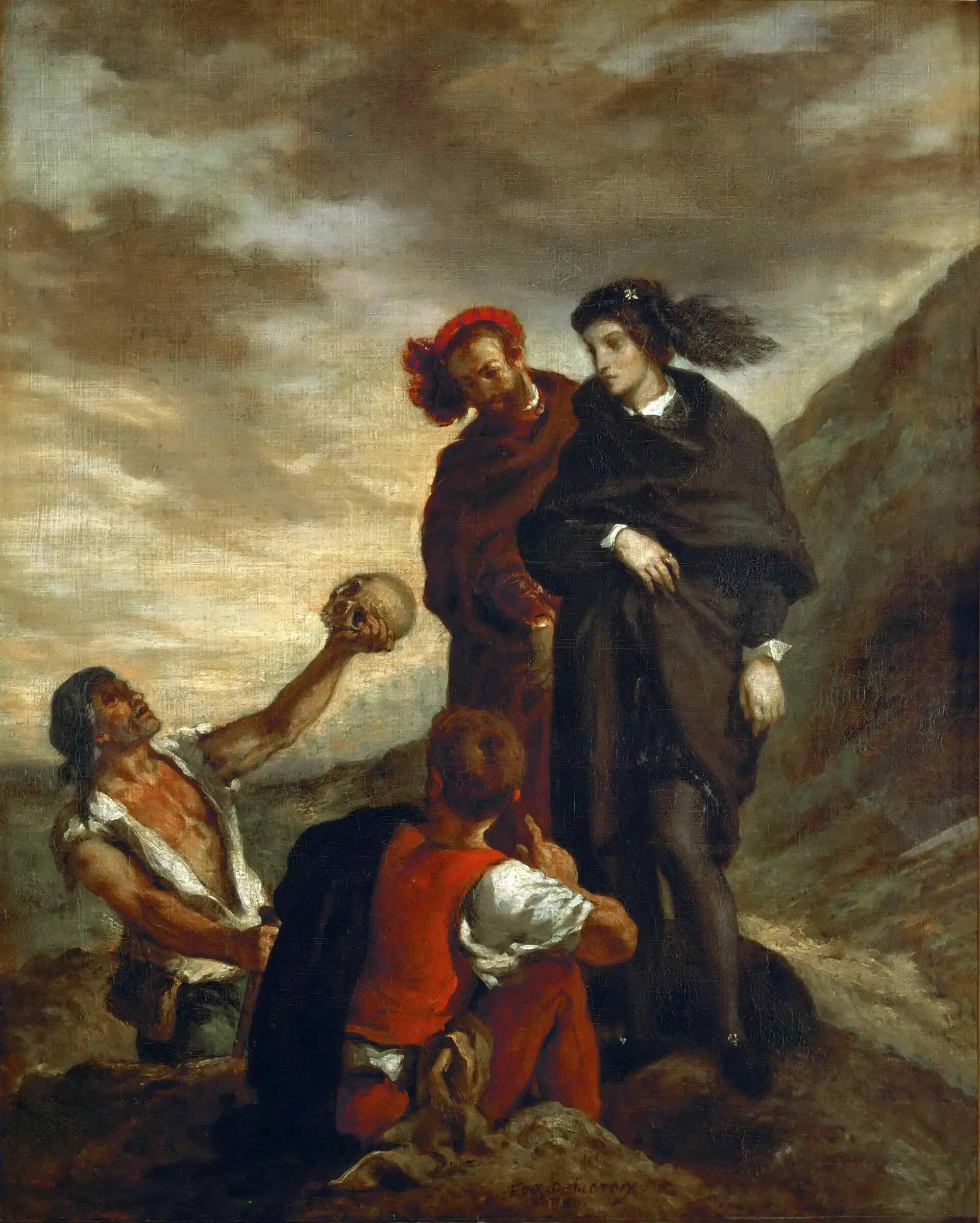 这幅画作描绘了莎士比亚戏剧《哈姆雷特》中的经典场景。画面中可以看到哈姆雷特和他的密友赫瑞修站在墓地之中。哈姆雷特的表情凝重而深思,似乎在思考生命和死亡的意义。赫瑞修则紧紧地盯着哈姆雷特,显得担忧和忧虑。画家德拉克洛瓦通过细腻而精确的绘画技巧,将角色的情感表达得十分逼真。他成功地刻画出了哈姆雷特和赫瑞修的内心世界,让人们更深刻地理解了这一经典场景的内涵。