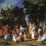 《诸神之宴》是贝里尼一生所画的最后一幅杰作,尤其是画在画布上面,因为他以前所画的作品大多是画在木板上的。在木板上作画需要能小心翼翼的控制颜料,这种工夫使他能够在画布上创造出十分精致的画面。《诸神之宴》这幅色彩丰盛的画取材于奥维德的《盛宴》中的诗句,描述在一次酒神的盛宴中,生殖神普...