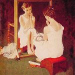 天真无邪的小女孩,穿著白色睡裙,坐在镜子前,歪着头端详自己的面容,顾影自怜。她的膝头敞开一页女影星的照片,脚旁散置着一只口红与两把梳子,与镜旁倒卧着的布娃娃遥相对应。这幅画就这样真实地描绘了小女孩的可爱、纯真和梦想。 △洛克威尔《对镜女孩》 诺曼·洛克威尔(1894-1978)1...