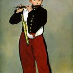画中描绘的是近卫军乐队里的一位少年吹笛手的肖像。画家在探索形与色的统一时,注意到人物个性特征的刻画。在色彩上追求一种稳定的、几乎没有变化的亮面,然后突然转入暗部,将人物置于浅灰色、近乎平涂的明亮背景中进行描绘,用比较概括的色块将形体显示出来。在这幅画中没有阴影,没有视平线,没有轮...