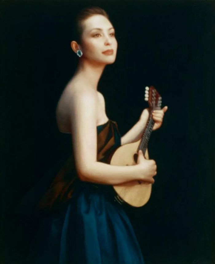 创作于1990年的《六弦琴》首次现身于陈逸飞于东京西武百货公司举办的个展,展览获得好评,盛称他为“画伯”(日语“大画家”的意思)。艺术家采用近乎炉火纯青的照相写实主义的技法以及精细的厚涂磨砂技巧把女音乐家精致的五官、浓密的秀发、白皙的肌肤、礼服绸缎的质感、凝视前方的眼神和乐器鲁特琴描画得细腻逼真,令人有伸手触摸的冲动。大面积黑色的背景运用,使得女音乐家显出雕塑一般的质感。同时光源从右侧打入,只把女音乐家的脸部、胸前、手部、乐器重点打亮,渲染气氛的同时突出人物形象,具有永恒的美感。